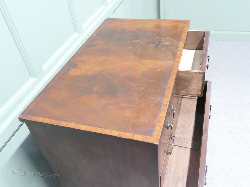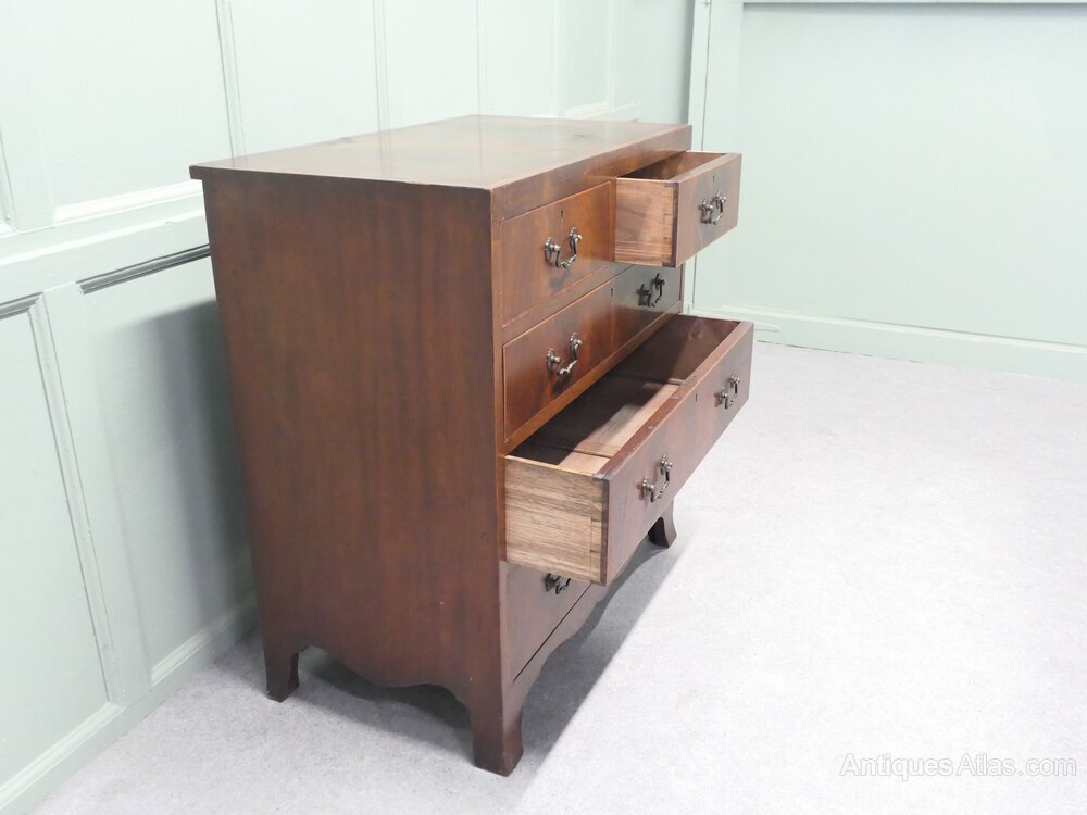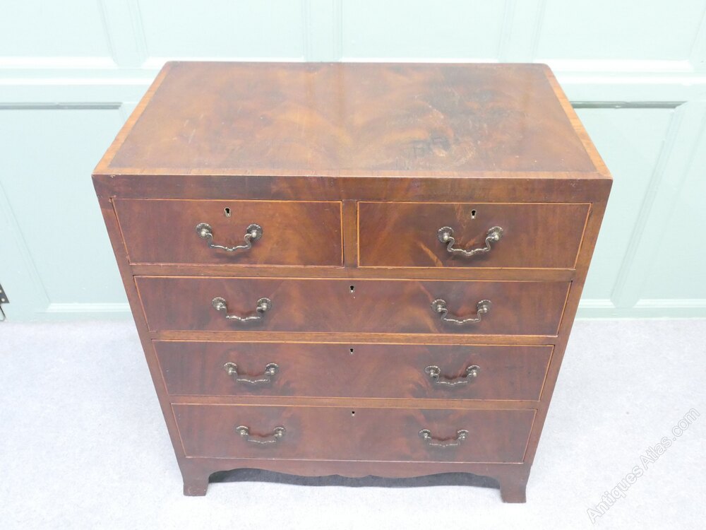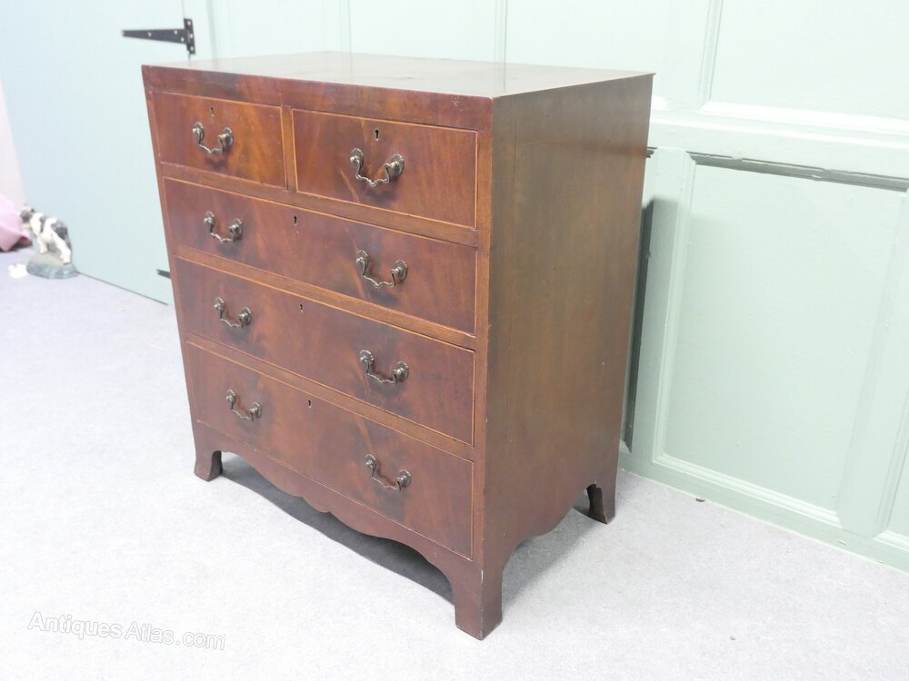 A Medium Size Flame Mahogany Georgian style Chest of DrawersThis is a good solid chest of drawers, the five drawer version like this one is becoming a lot more difficult to source these days, there are 2 short drawers over 3 full length graduated drawers below