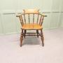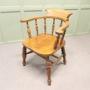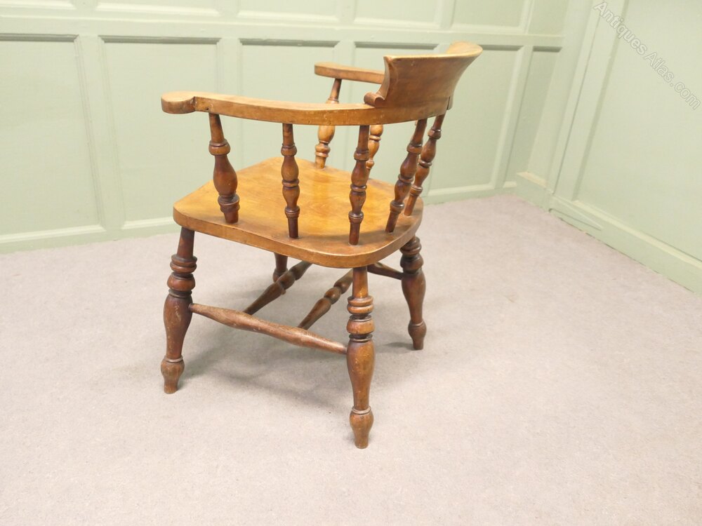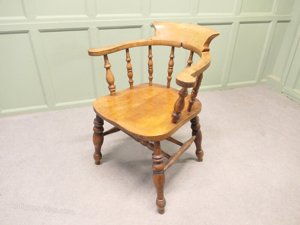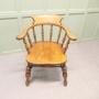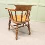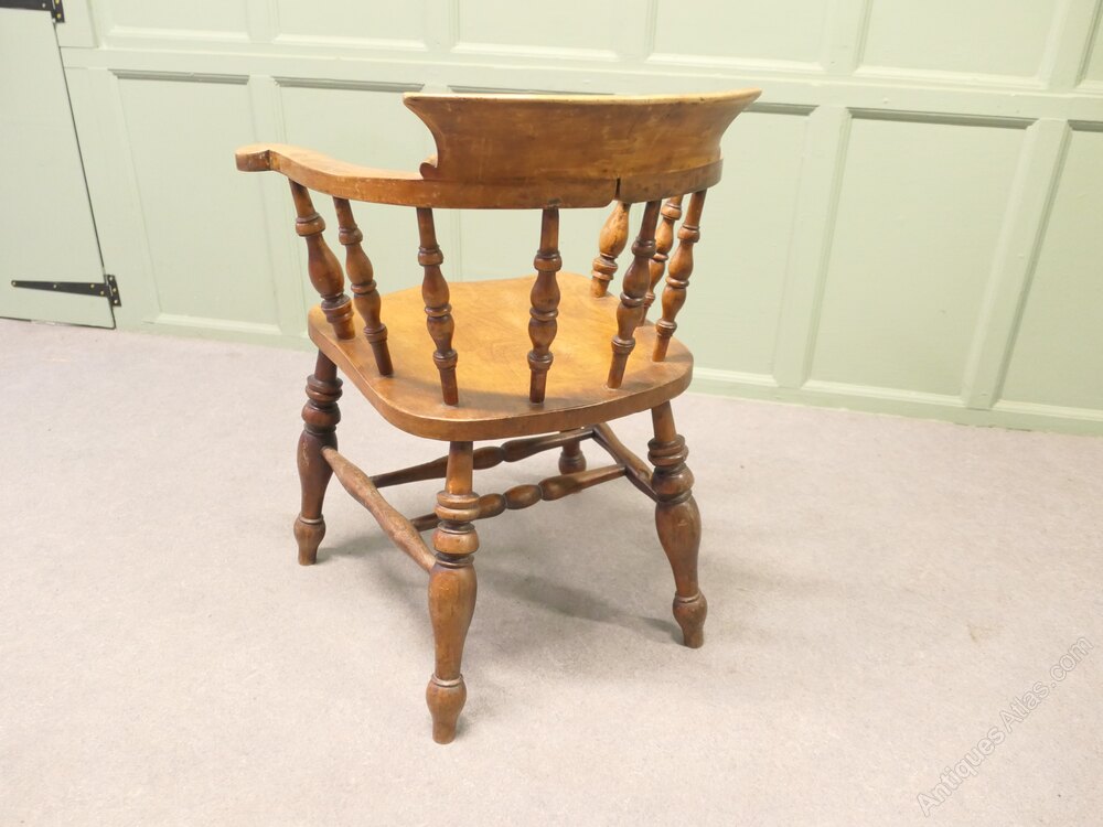 19th Century Beech and Elm Smokers Bow Office or Desk ChairThis solid chair has an attractive thick saddle shaped seat in Elm, it has a very wide curved top rail and chunky turned legs with twin stretchers beneath