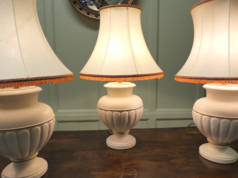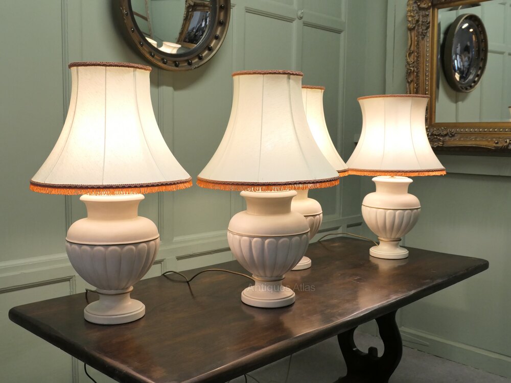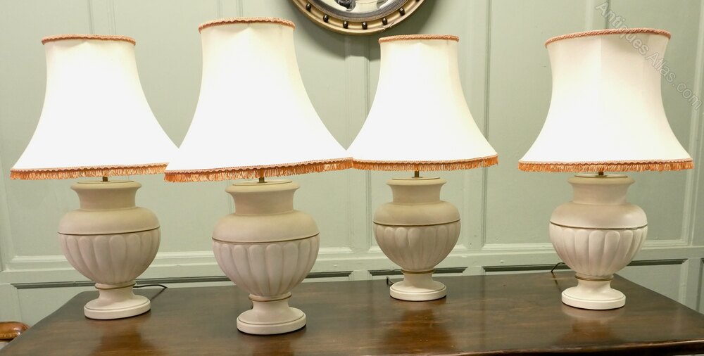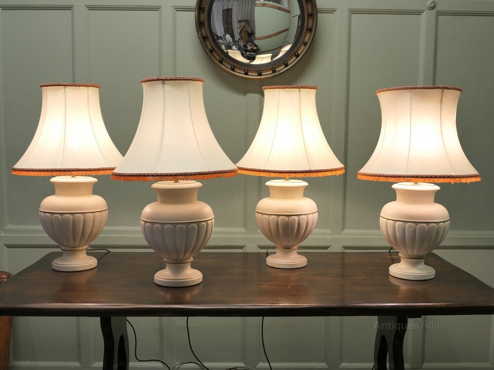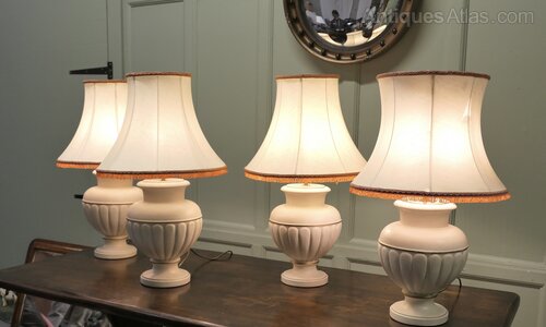 Set of 4 Ceramic Table Lamps with Linen ShadesA superb large set of 20th century bulbous ceramic table lamps