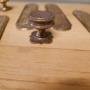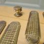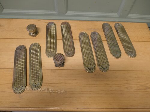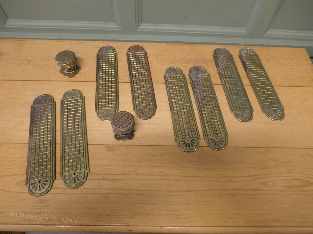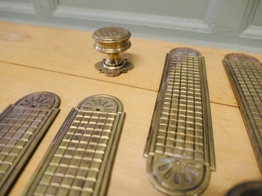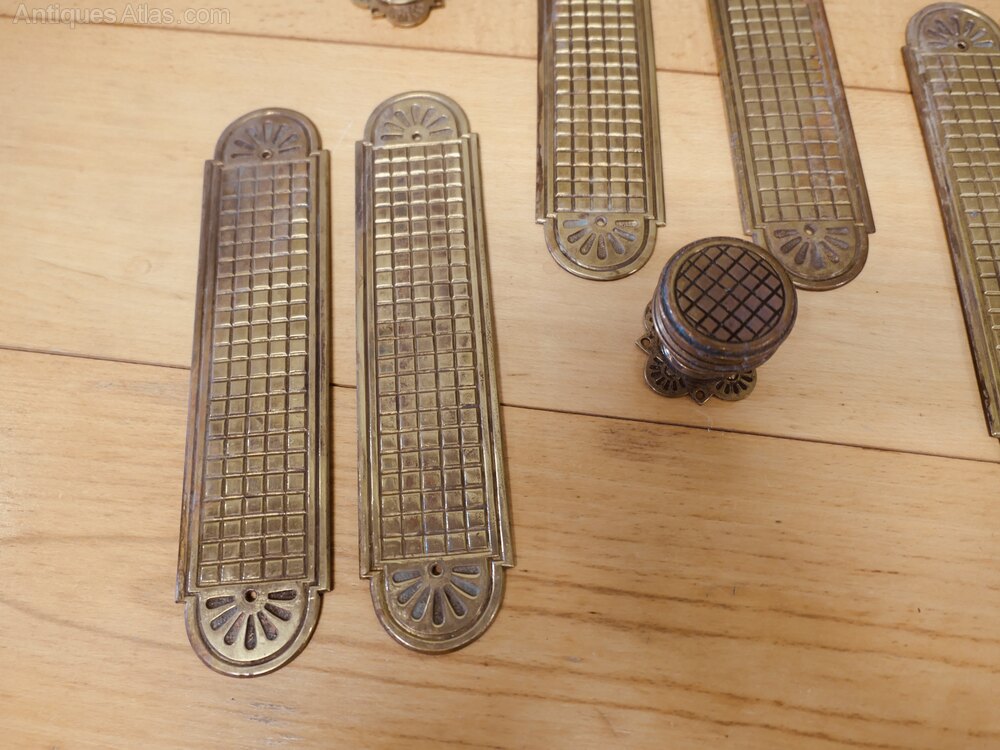 A Set of Heavy Arts and Crafts Brass Door Finger Plates and KnobsThere are 8 identical plates in this set, they are heavy, made in heavy brass and have a lattice decoration. The top and bottom of the plates have a rounded shape and they come with 2 matching lattice work brass door knobs