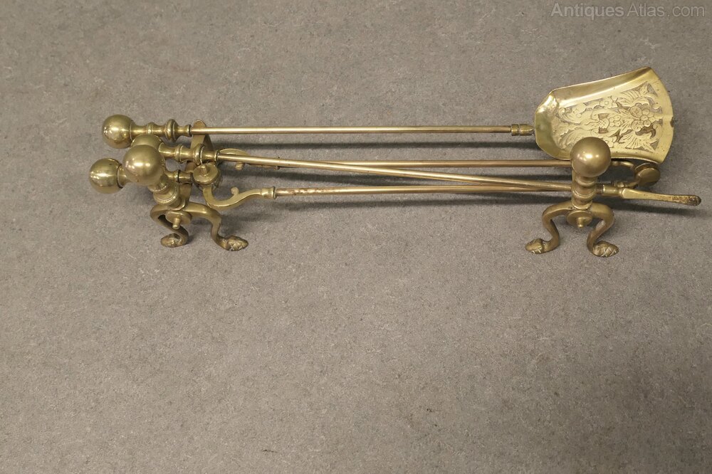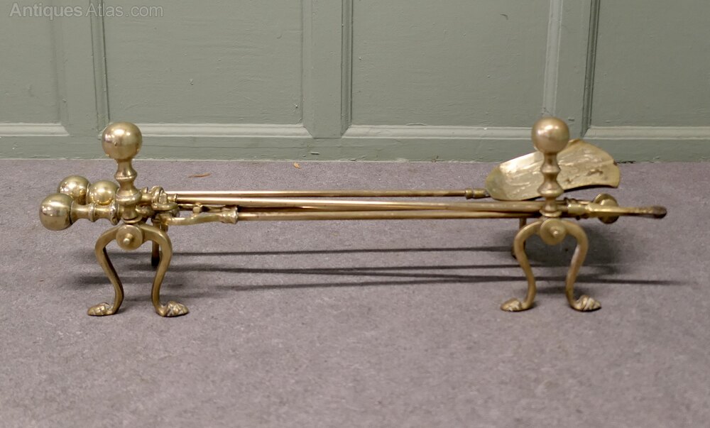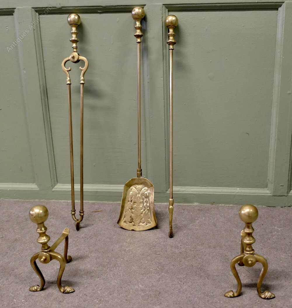 Heavy Gothic Fireside Tools on Andiron RestsThis is a long handled set on its own andirons, shovel, tongs and poker