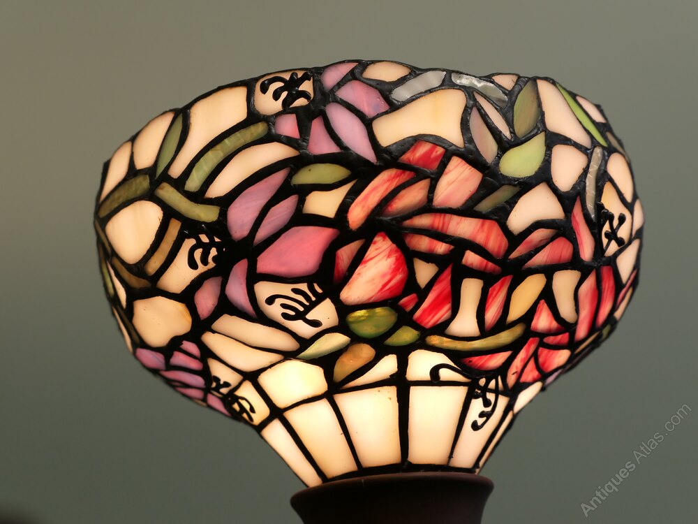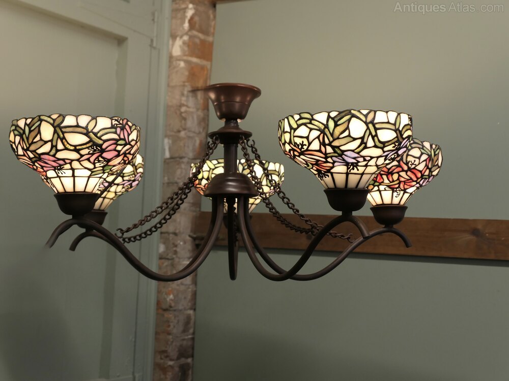 Large 5 Branch Ceiling Light, with Tiffany Style Lamp ShadesThis design is based on the Classic stained glass shades made and designed by Tiffany, the lamp has 5 long branches each with a leaded stained glass side, these are decorated with stylised flowers, the light would work very well over a Dining Table, the lamp is in good vintage condition