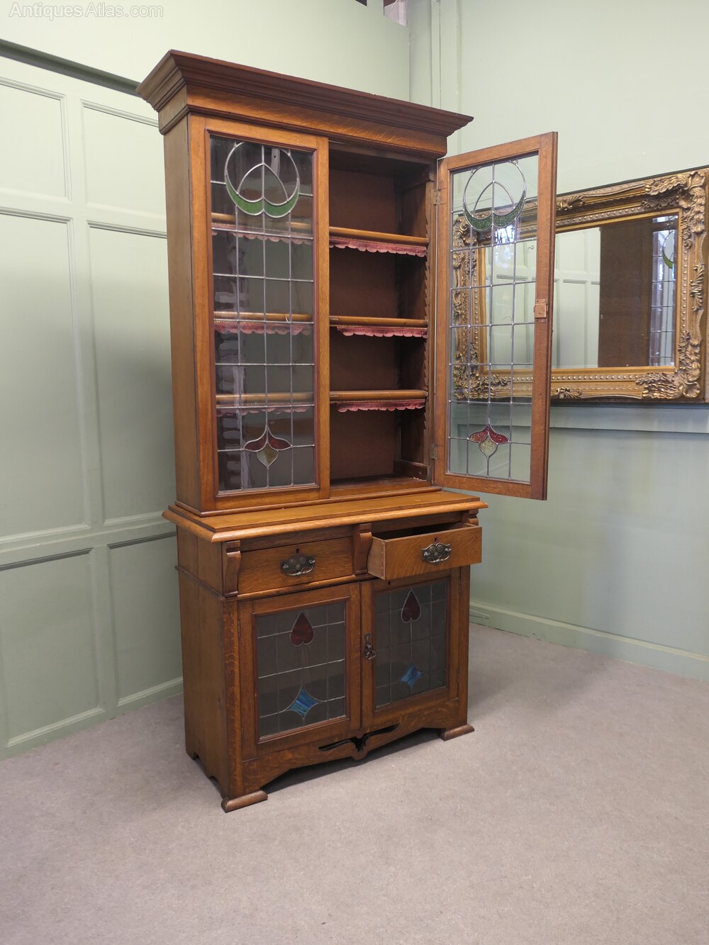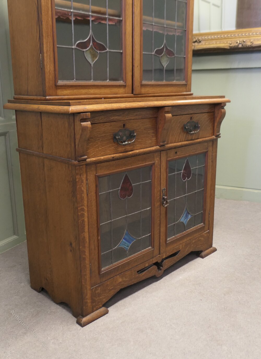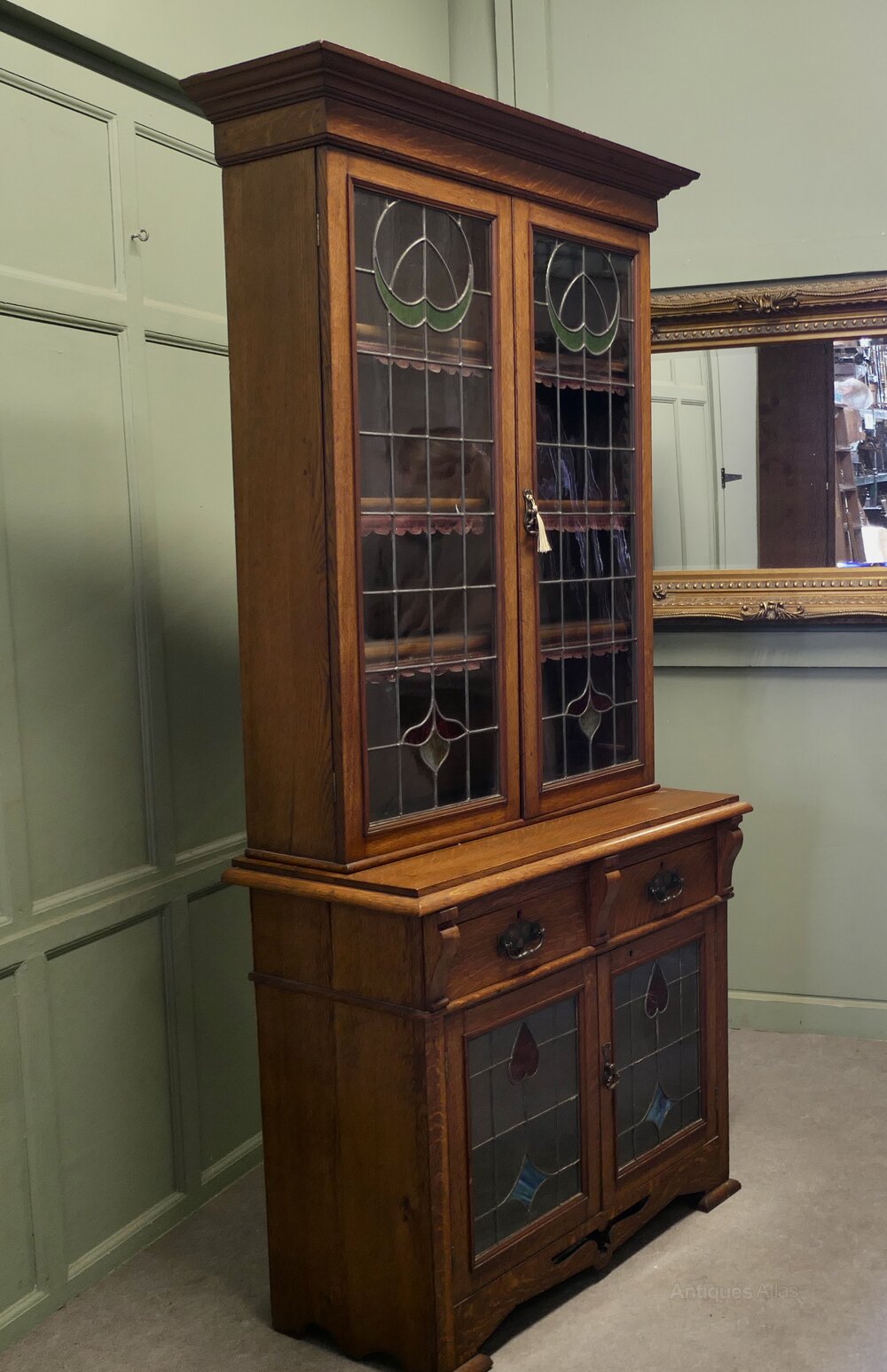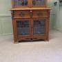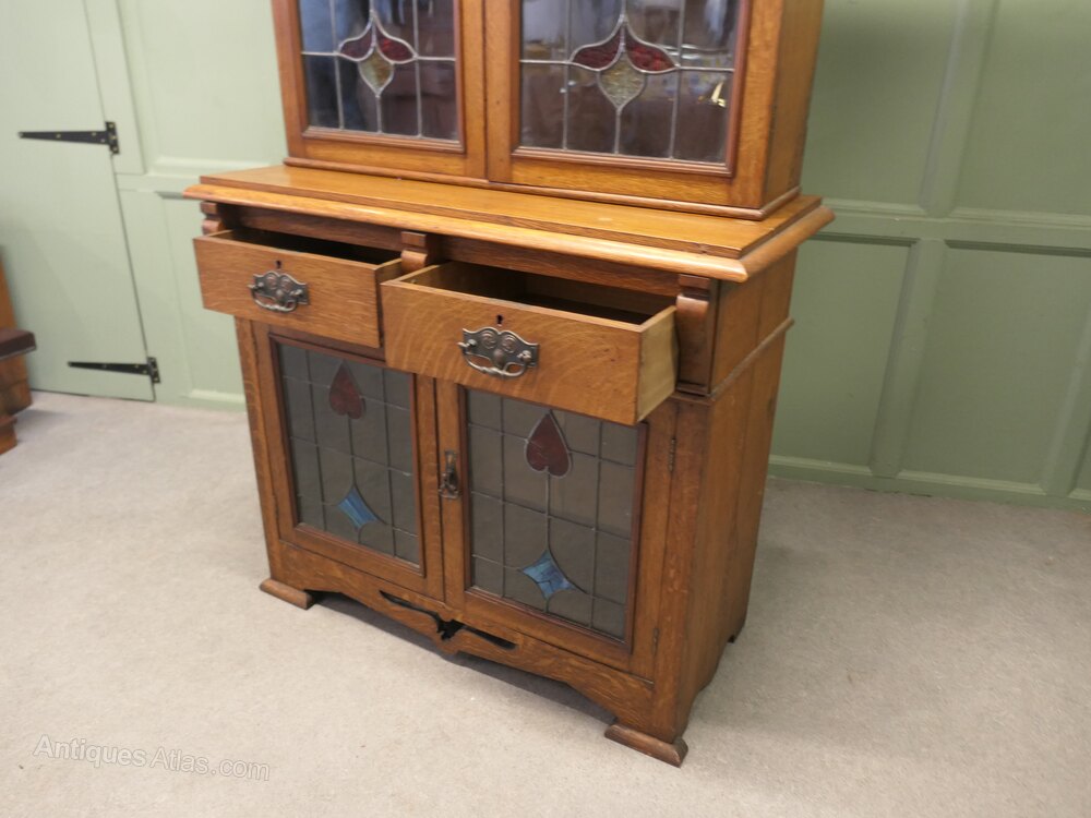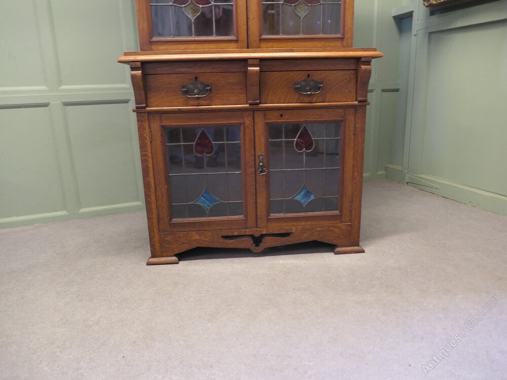 Arts and Crafts Golden Oak BookcaseThis is a tall elegant piece, dating from the later part of the 19th Century, the upper part of the bookcase is glazed with Arts and Crafts stained glass leaded doors enclosing 3 adjustable shelves, the lower part of the piece has 2 drawers and another glazed 2 door cupboard