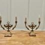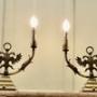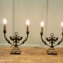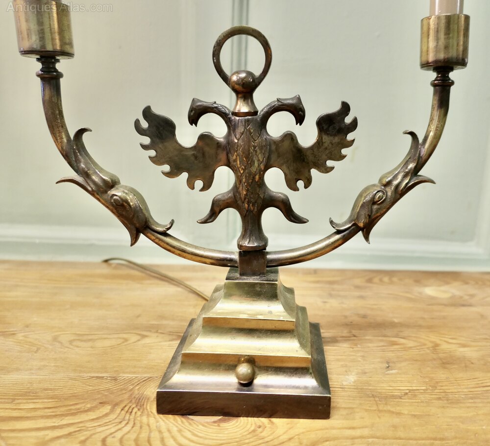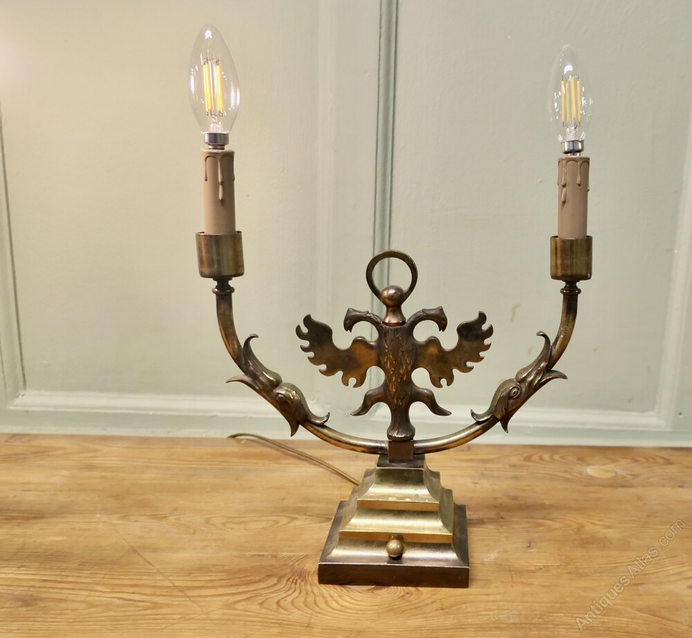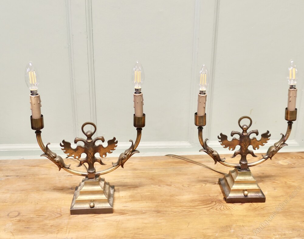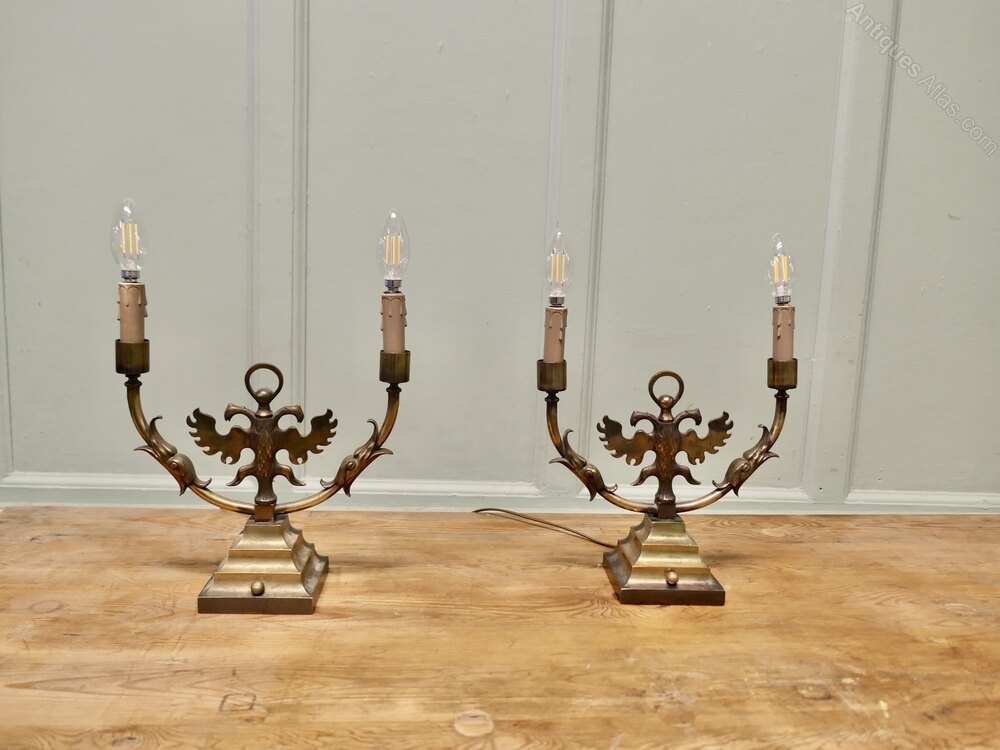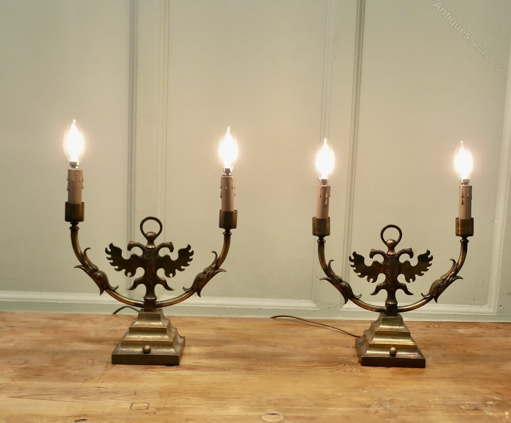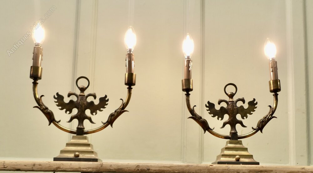 Pair of Arts and Crafts Gothic Brass Twin Table LampsThese are grand looking pieces, the lamps are made in brass, they have candle type sconces and a double headed winged griffon at the centre