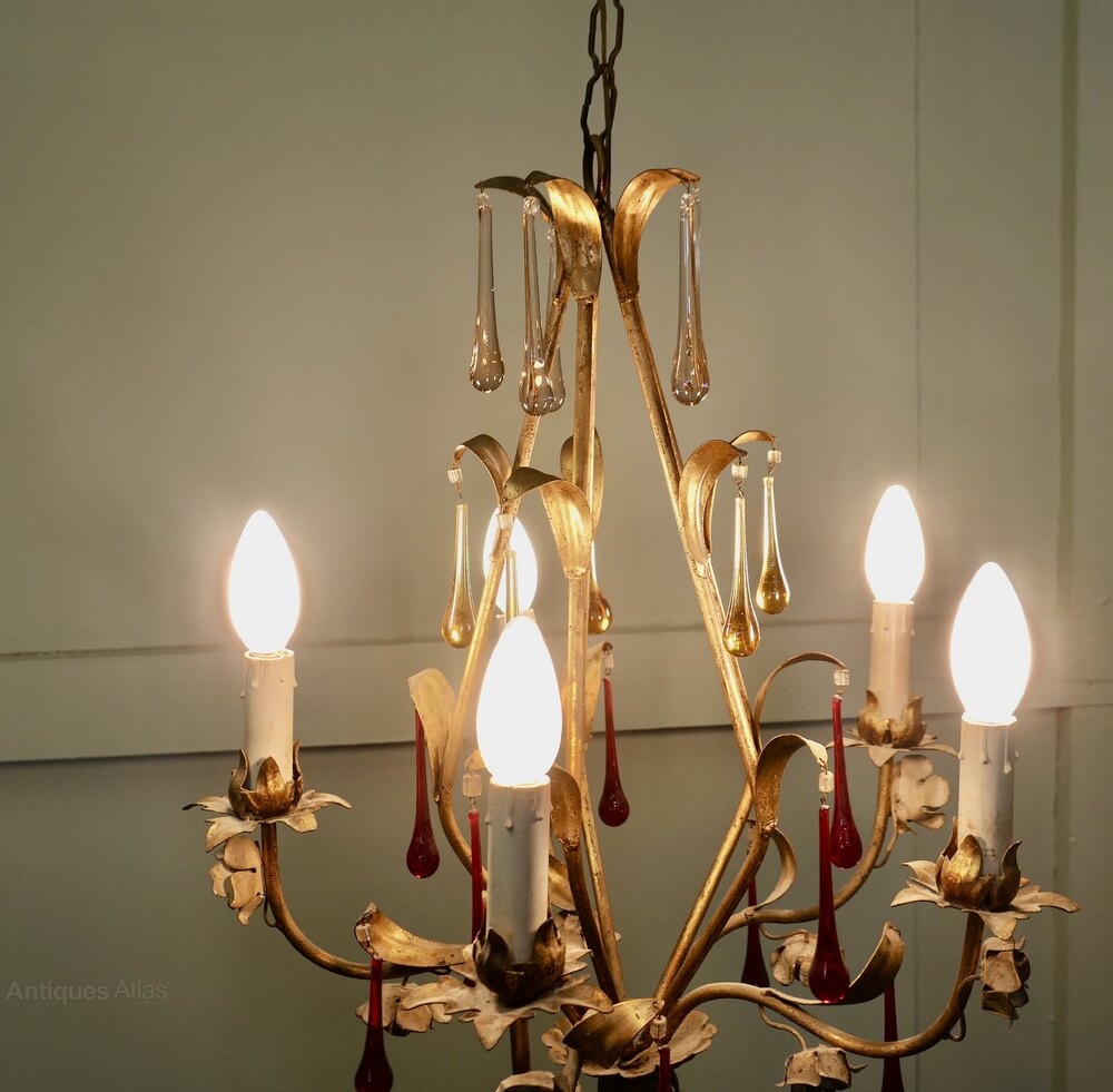 French Chandelier Hung with Coloured Crystal TeardropsThis is a stunning piece, the gilded toleware frame is hung with long teardrop crystals ranging in shades of autumn colours