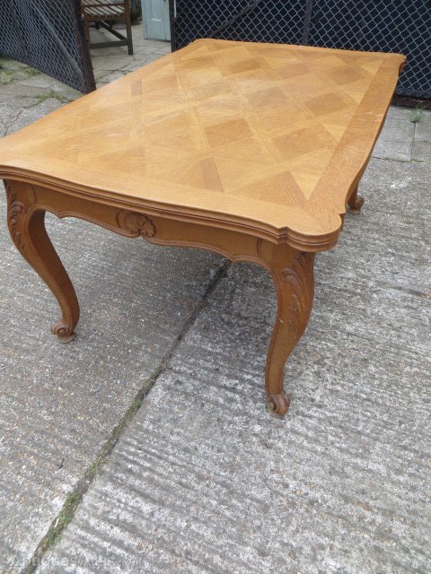 Vintage French Oak Draw Leaf Dining Table with Carved sides and Cabriole Legs .This table has had Brackets fitted around the frame but is sound .76 cm high ,100 cm deep,150 cm long 248 cm fully extendedShipping information