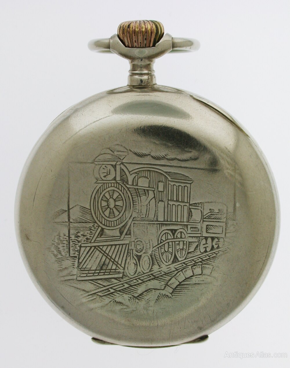 The case is enhanced by an intricately engraved steam locomotive