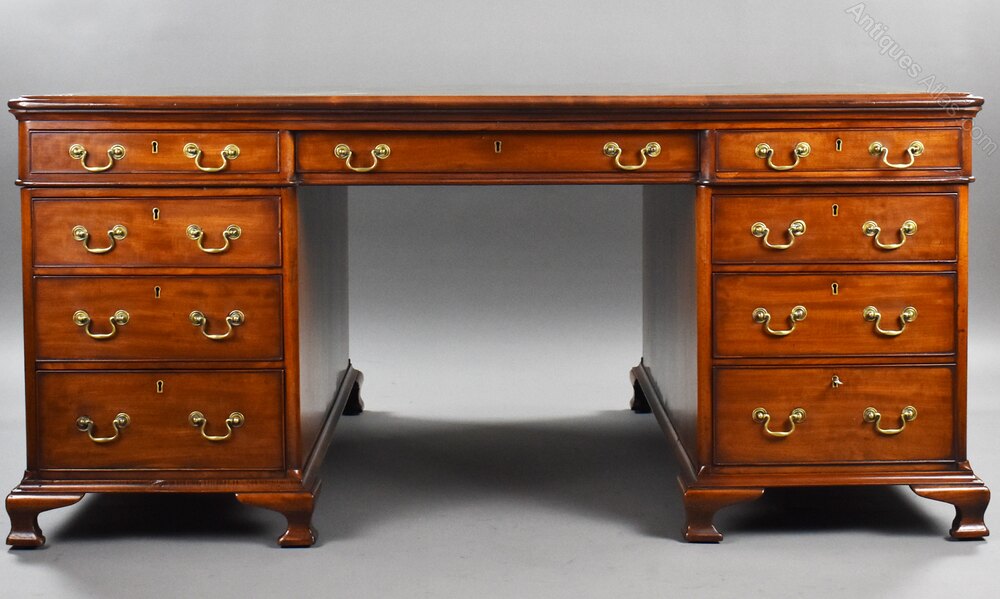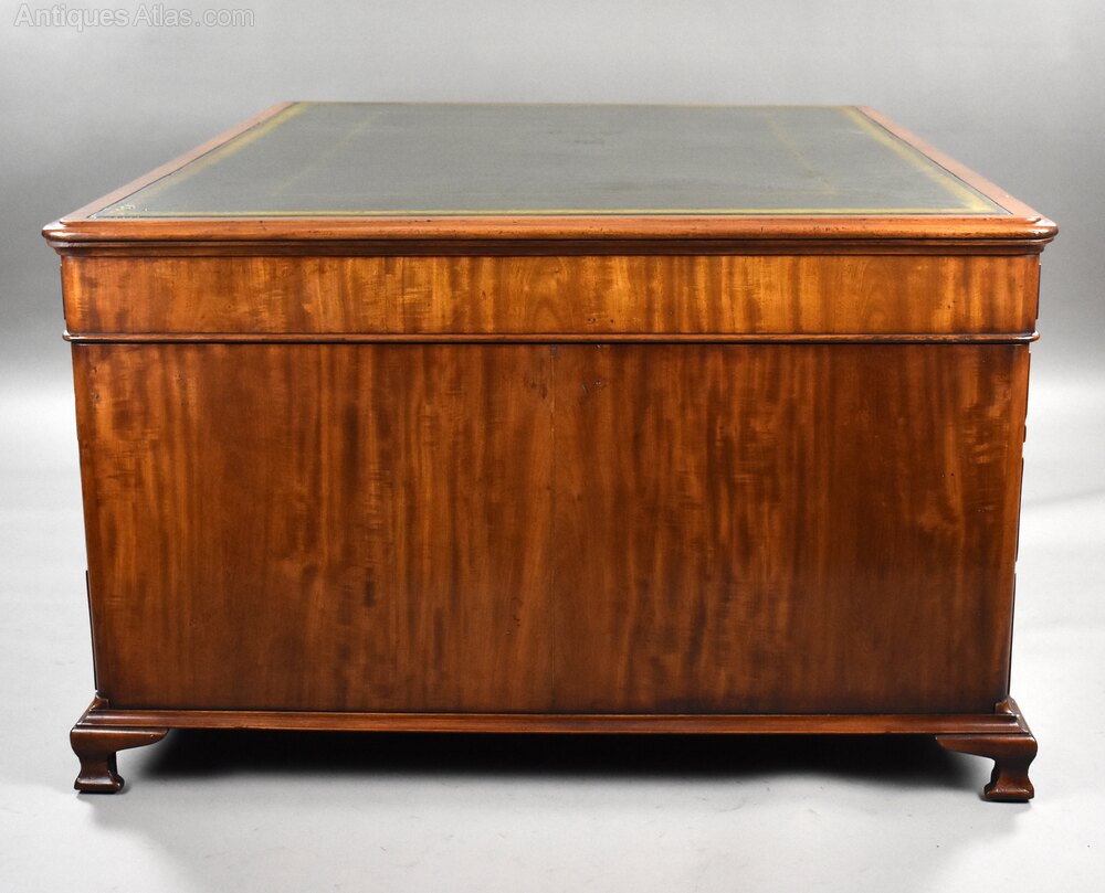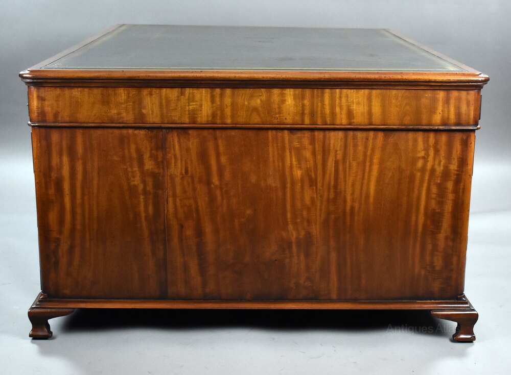 Crafted from the finest quality mahogany, this desk boasts a beautifully figured grain and a rich, glowing patina developed over more than a century. The impressive rectangular top is inset with a superb green gilt-tooled leather writing surface, gently worn to perfection, bordered by a moulded mahogany edge that frames the piece with understated sophistication.