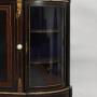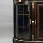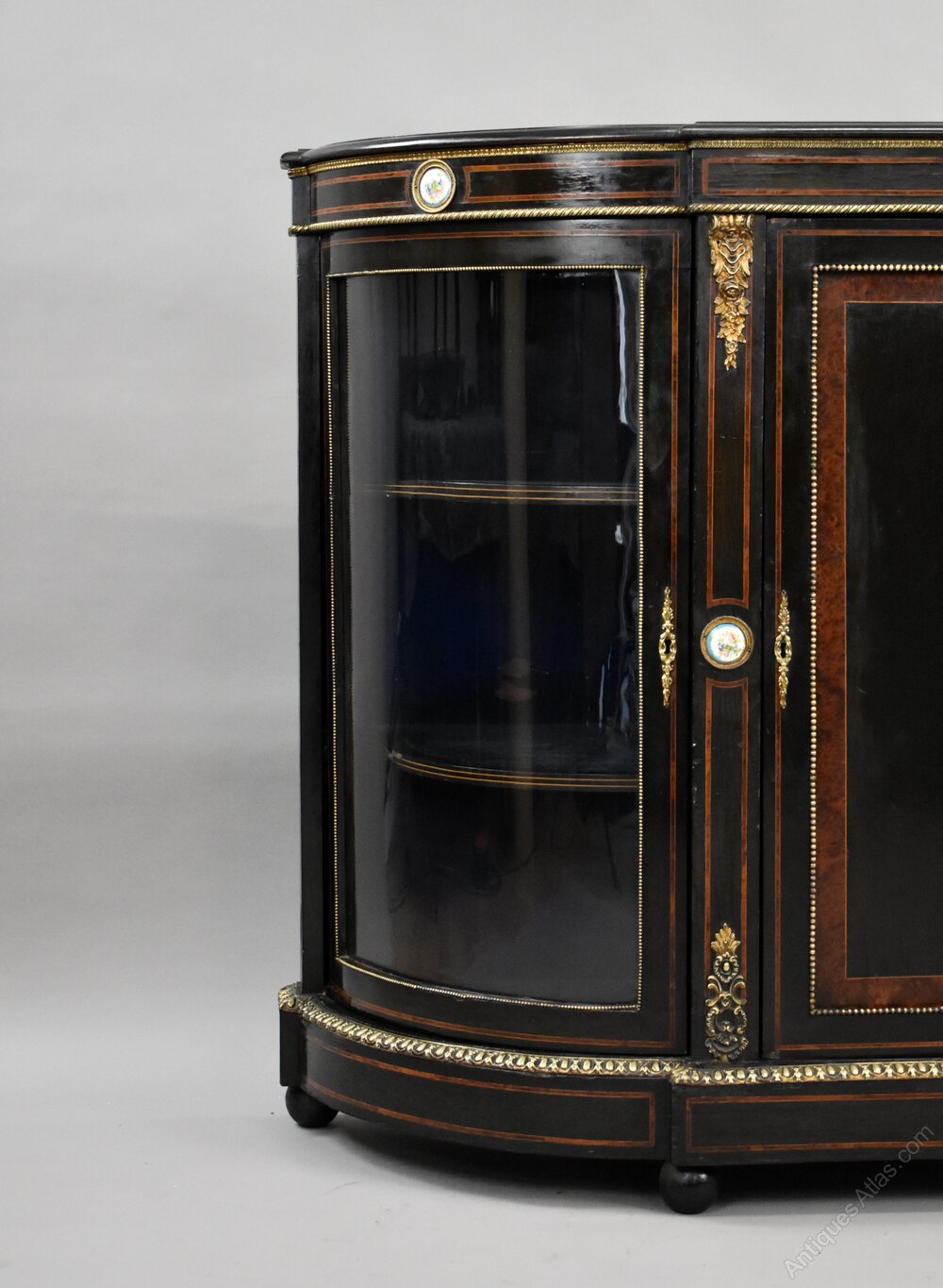 The credenza’s flanking bow-fronted glazed display cabinets retain their original curved glass and velvet-lined interiors with brass inlaid shelves — ideal for showcasing fine porcelain or glassware. The top and borders are enhanced with delicate stringing, gilt beading, and a rich burr walnut banding that contrasts beautifully with the deep ebonised finish.