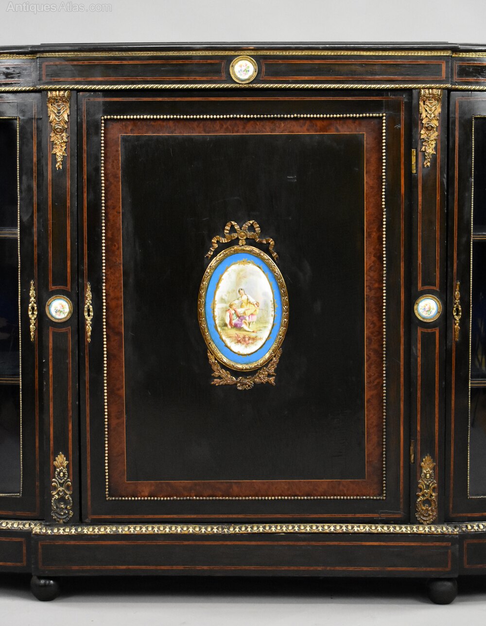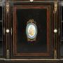 A late Victorian ebonised credenza, richly embellished with fine ormolu mounts and hand-painted porcelain plaques in the French Louis XVI style.The shaped front features a central panel adorned with an oval Sevres-style porcelain plaque depicting a romantic pastoral scene, framed by ornate gilt mounts. Matching circular porcelain roundels further decorate the frieze and door panels, adding symmetry and opulence.