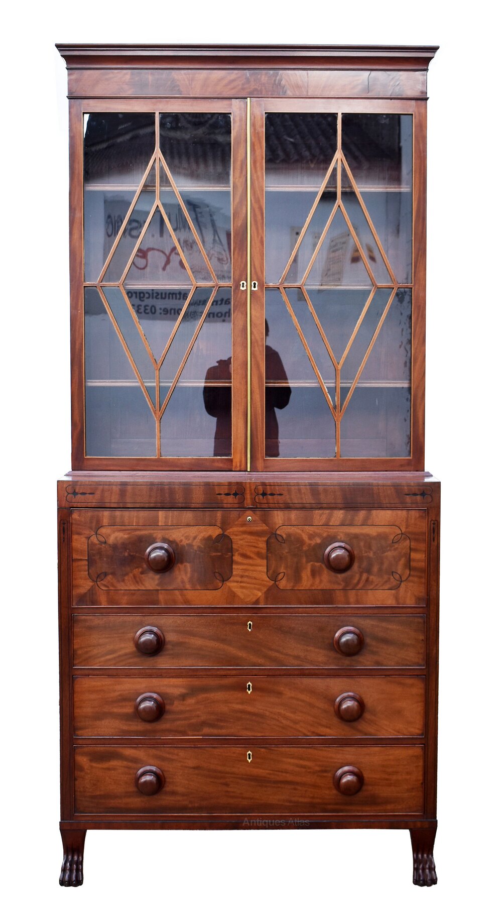 An exceptional William IV flame mahogany secretaire bookcase of elegant proportions. The upper section features a pair of glazed doors with striking geometric astragal glazing bars, opening to reveal adjustable shelving for books or display. Below, the lower section is fitted with a secretaire drawer, opening to a fitted interior with small drawers and pigeonholes, above three further graduated drawers. The whole is raised on boldly carved lion’s paw feet, a distinctive feature of the period. Crafted in richly figured flame mahogany with a superb colour and patina, this piece exemplifies the refined craftsmanship of the early 19th century.