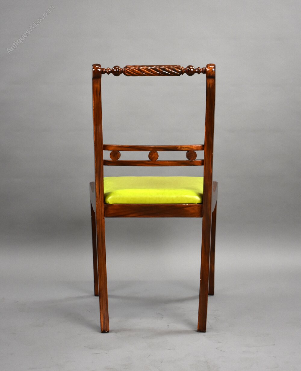 A handsome set of ten Regency style dining chairs, crafted with elegant swept back legs, carved rope-twist top rails, and decorative roundel details to the back splats. The rich polished timber frames provide beautiful warmth and depth, complemented by the vibrant upholstered seats which offer a striking contrast and a comfortable sitting position.