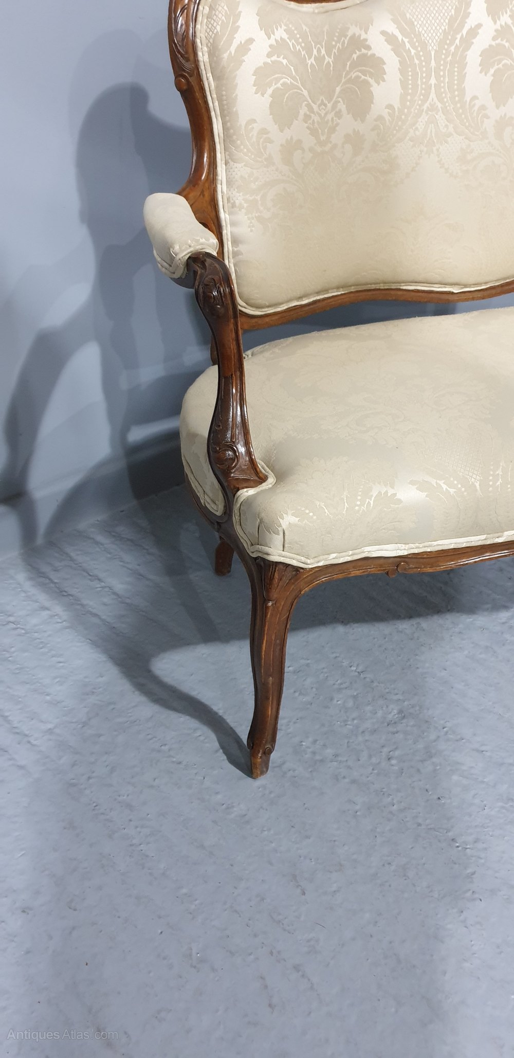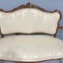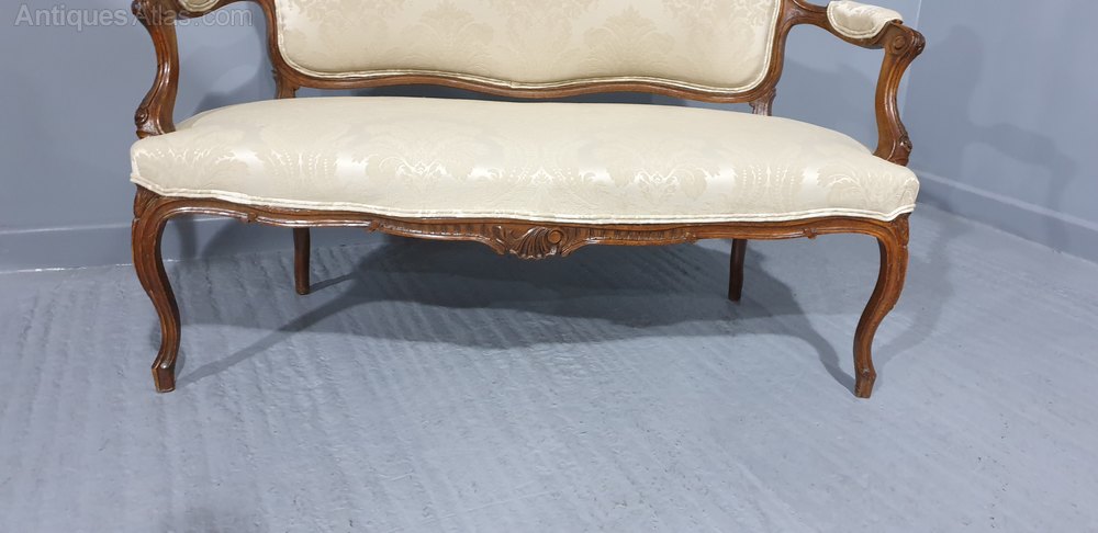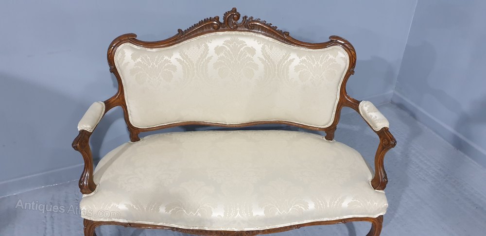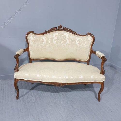 A very good French walnut two seater sofa, very crisp carvings, upholstered in ivory damask, in excellent overall condition.39.5" high