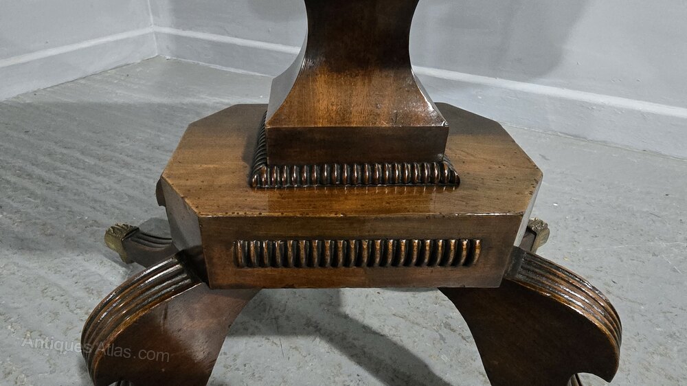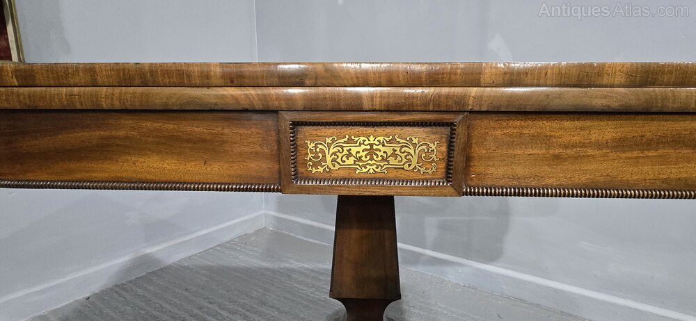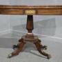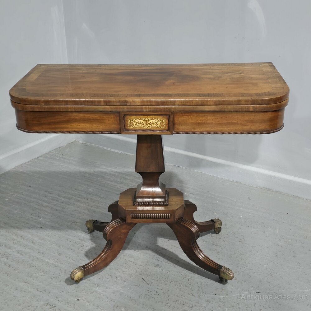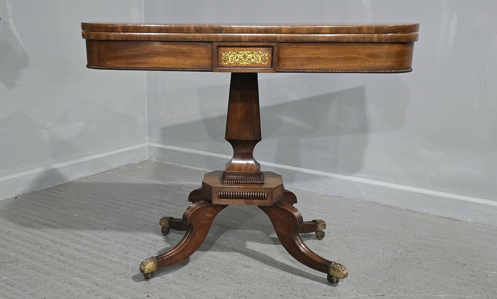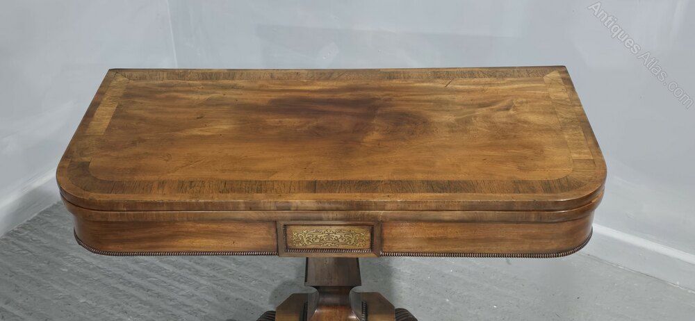 A superb quality Regency mahogany card table with rosewood and brass inlay standing on centre pedestal with brass toes, green baise interior, lovely colour and condition.30" high