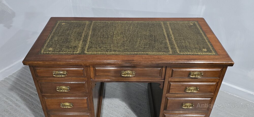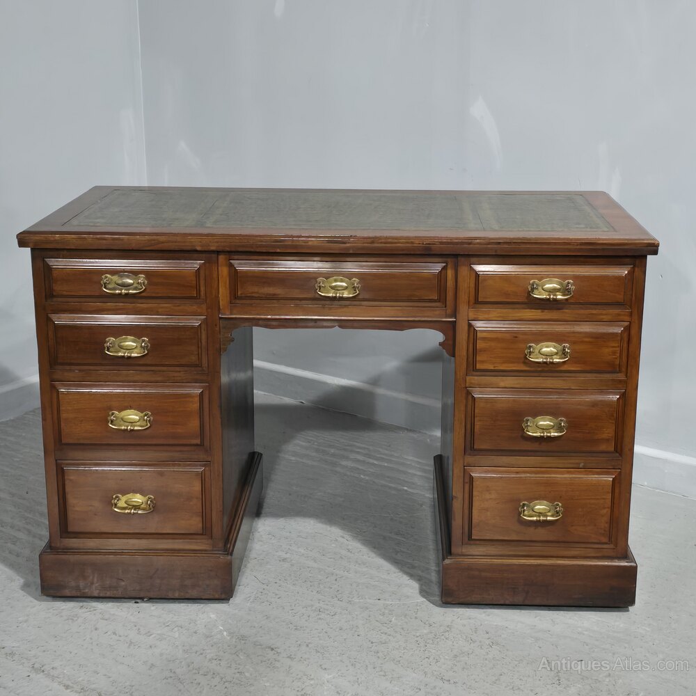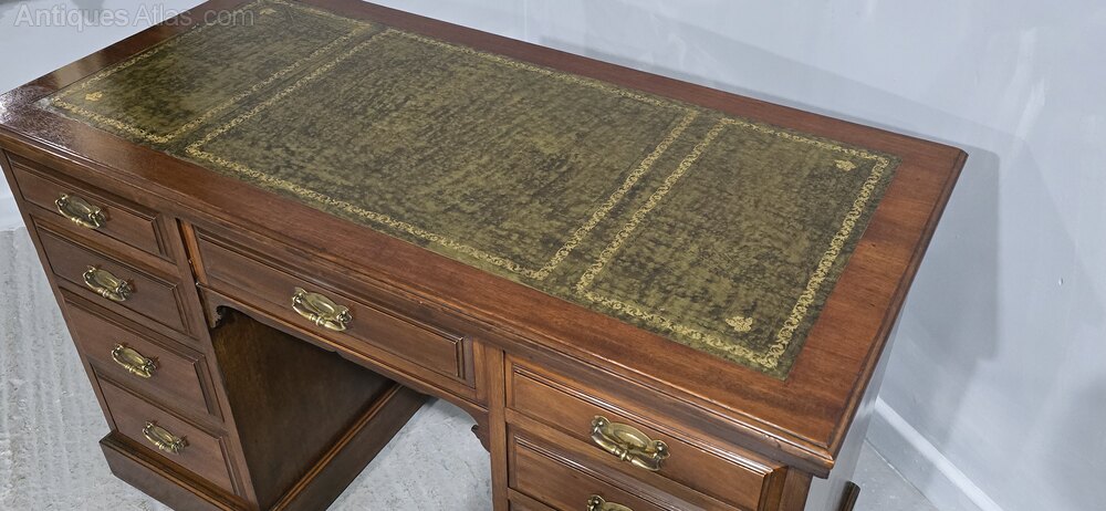 A good mahogany nine drawer pedestal desk, with brass handles and green leather top, in very good condition throughout.30.75" high