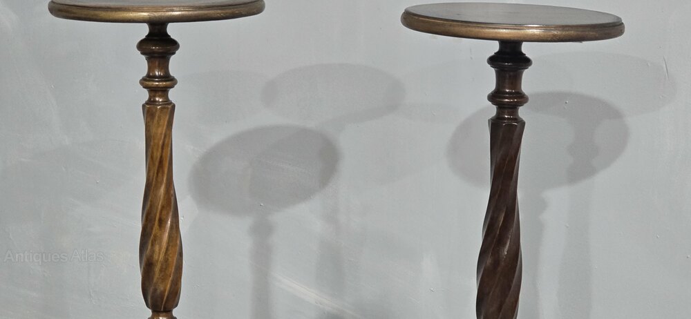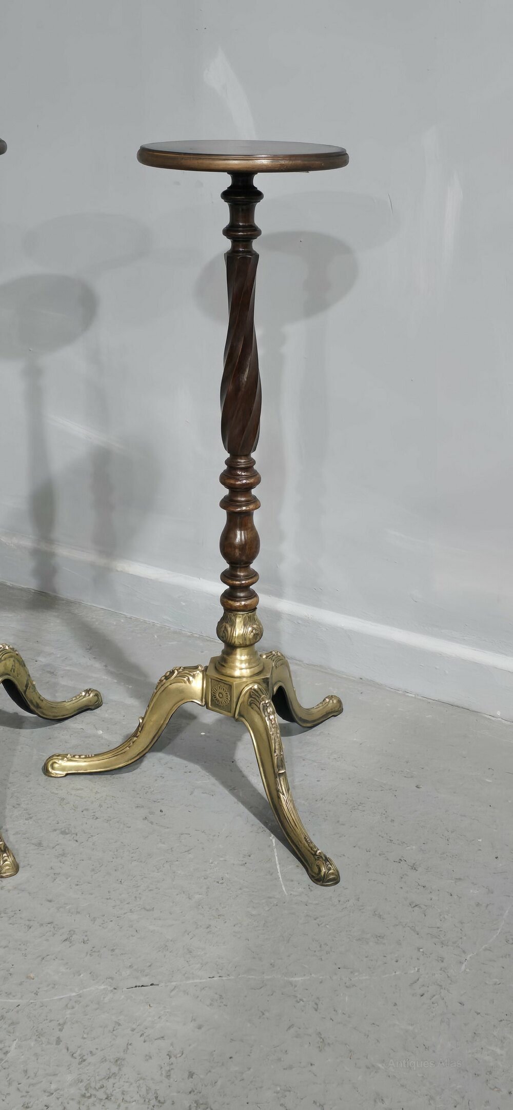 A very good pair of twisted mahogany torchere stands with brass three leg base, in overall excellent condition.FREE DELIVERY TO UK MAINLAND