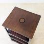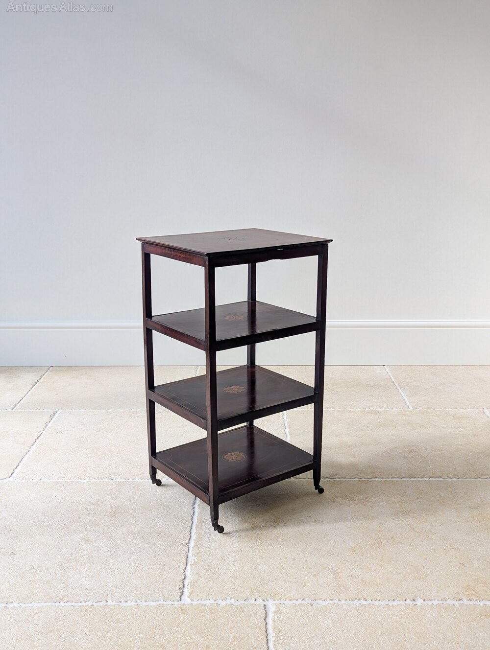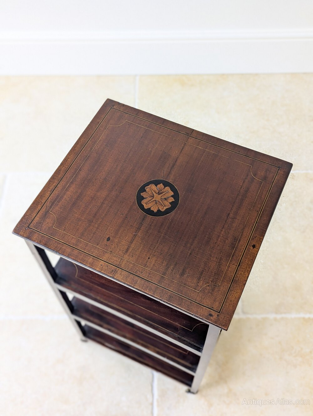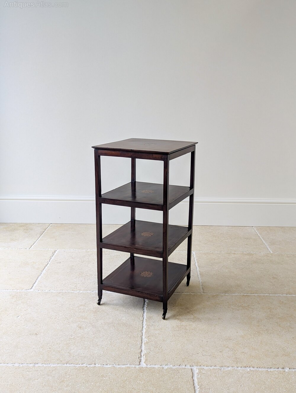 Presented in very good antique condition with a warm aged patina and minor marks from use, including a small loss to the inner frame beneath the top. The inlay is intact and the castors run freely. There is some minor age-related shrinkage visible to the lower shelves, entirely stable and typical of mahogany of this period. Everything is sturdy, structurally sound, clean and ready to place in the home.