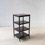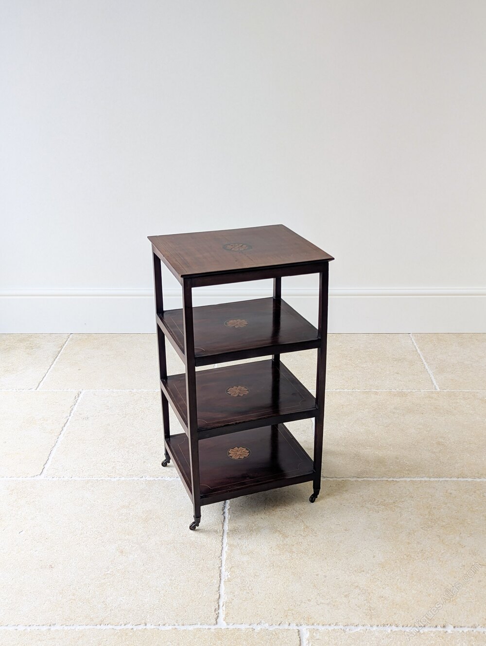 A compact four-tier whatnot in the Sheraton Revival style crafted in well-figured mahogany. The square shelves are each centred by a marquetry roundel, the tiers outlined with fine double line stringing and shaped corner details, all raised on straight square legs and set on quality original small brass castors.Light and refined in character, this is the English whatnot form sometimes also called an étagère. The scale is suited to a range of uses, from display to housing books or curios. Easy to move into position as needed on its castors, with a small footprint that tucks neatly beside a chair or sofa.