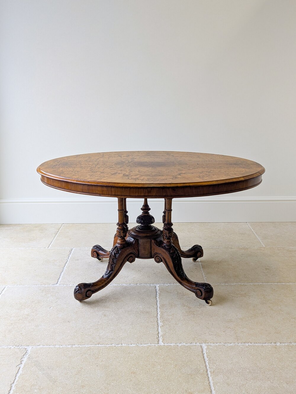 A large Victorian tilt-top centre table finished with a richly figured, bookmatched burr walnut oval top with fine floral marquetry inlay and thumb-moulded edge. Set on a well-carved solid walnut clustered pedestal base with turned column supports and a central finial, raised on four bold cabriole legs with acanthus carving and original brass and ceramic castors.The combination of the figured burr walnut inlaid top and heavily carved, imposing base gives the piece real presence, ideal as an impressive hall or drawing room centre table or equally suitable for four-person dining.