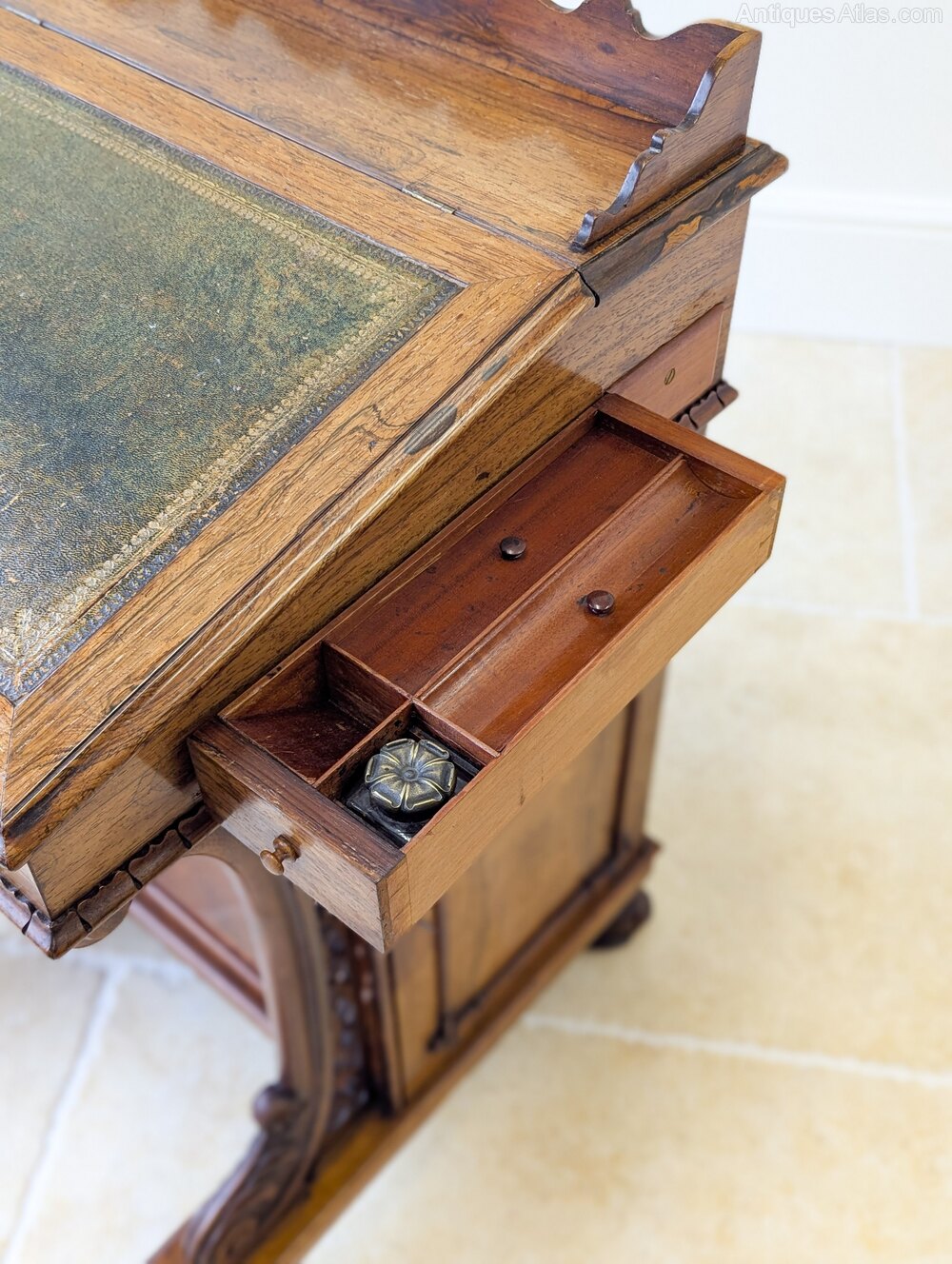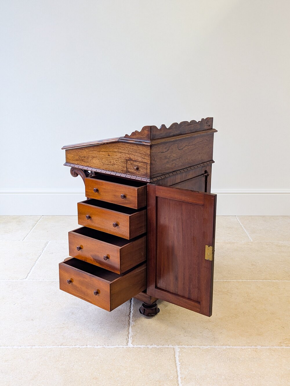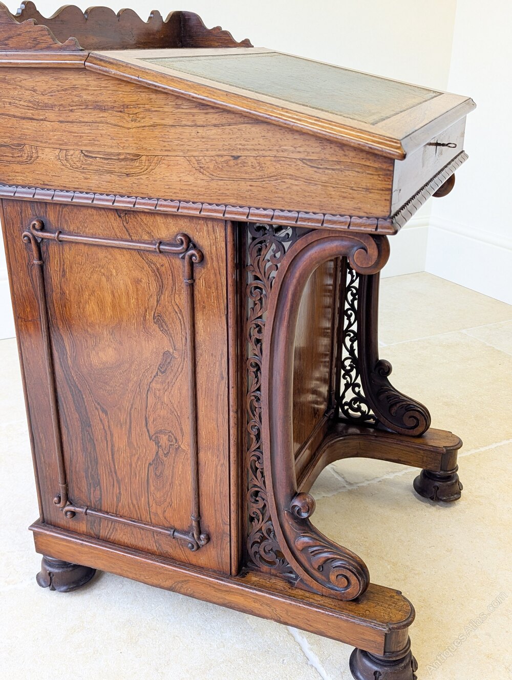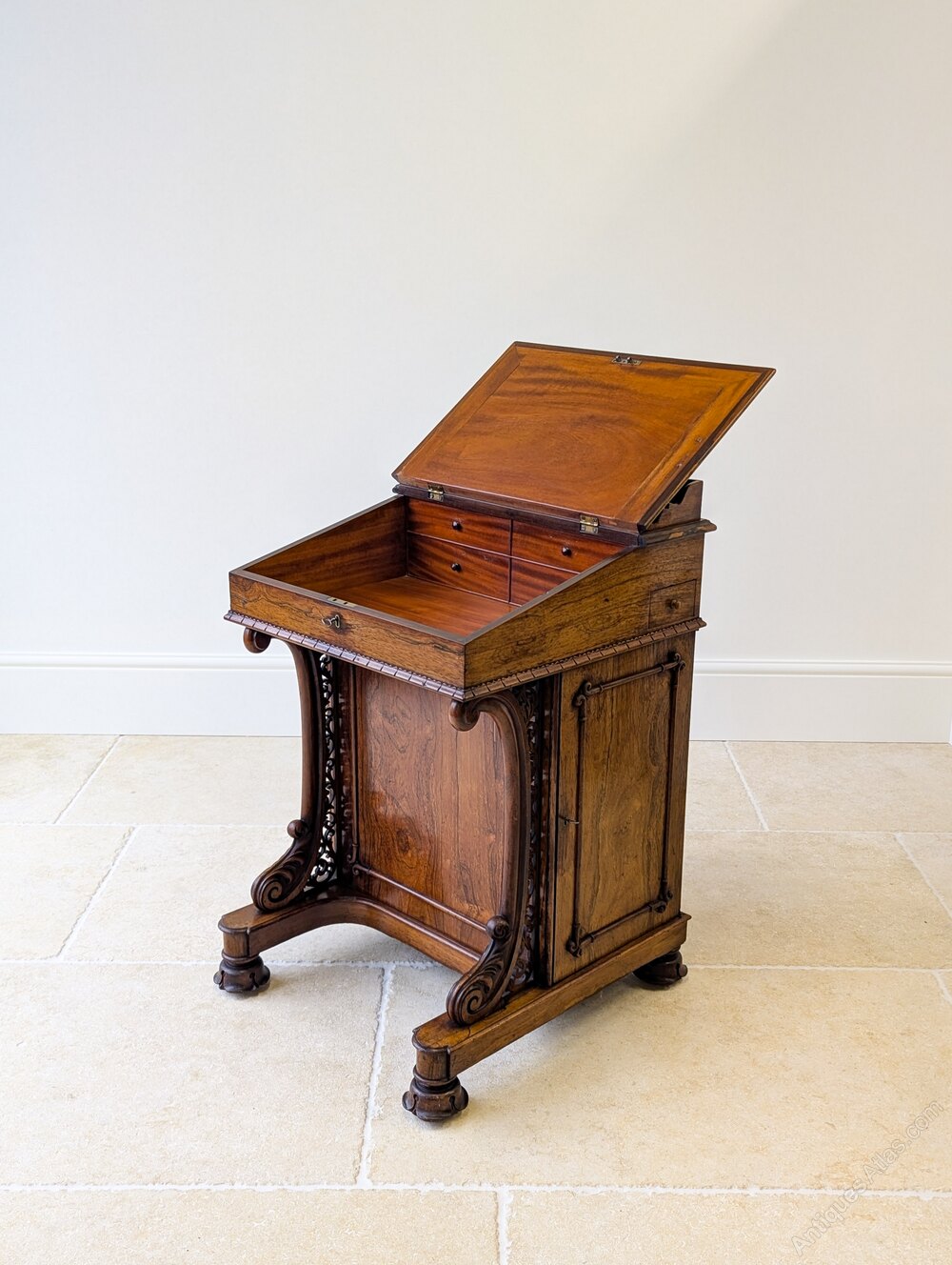 A finely made William IV rosewood Davenport desk, crafted in exceptional rosewood and stamped by the maker W&C Wilkinson of Ludgate Hill. Classic Davenport form with a sloping writing surface, gilt-tooled inset leather and a bank of mahogany drawers concealed behind a locking panelled door. The front supports are elegantly carved in scrolling rosewood with pierced fretwork panels, all hand-cut and typical of the very best London cabinetmaking of the 1830s.The writing surface unlocks and lifts open to a spacious interior with two small upper drawers above two dummy drawers. To the right-hand side sits a sliding pen drawer with its original dividers and complete with period brass-mounted inkwell. Wonderfully shaped hollow bun feet with concealed brass castors complete the design and allow the desk to be easily positioned as needed within a room.