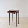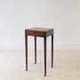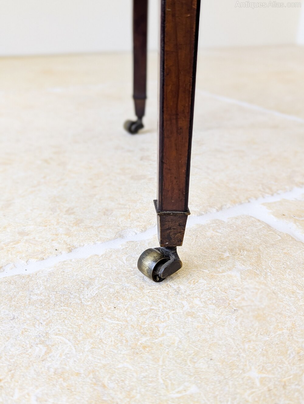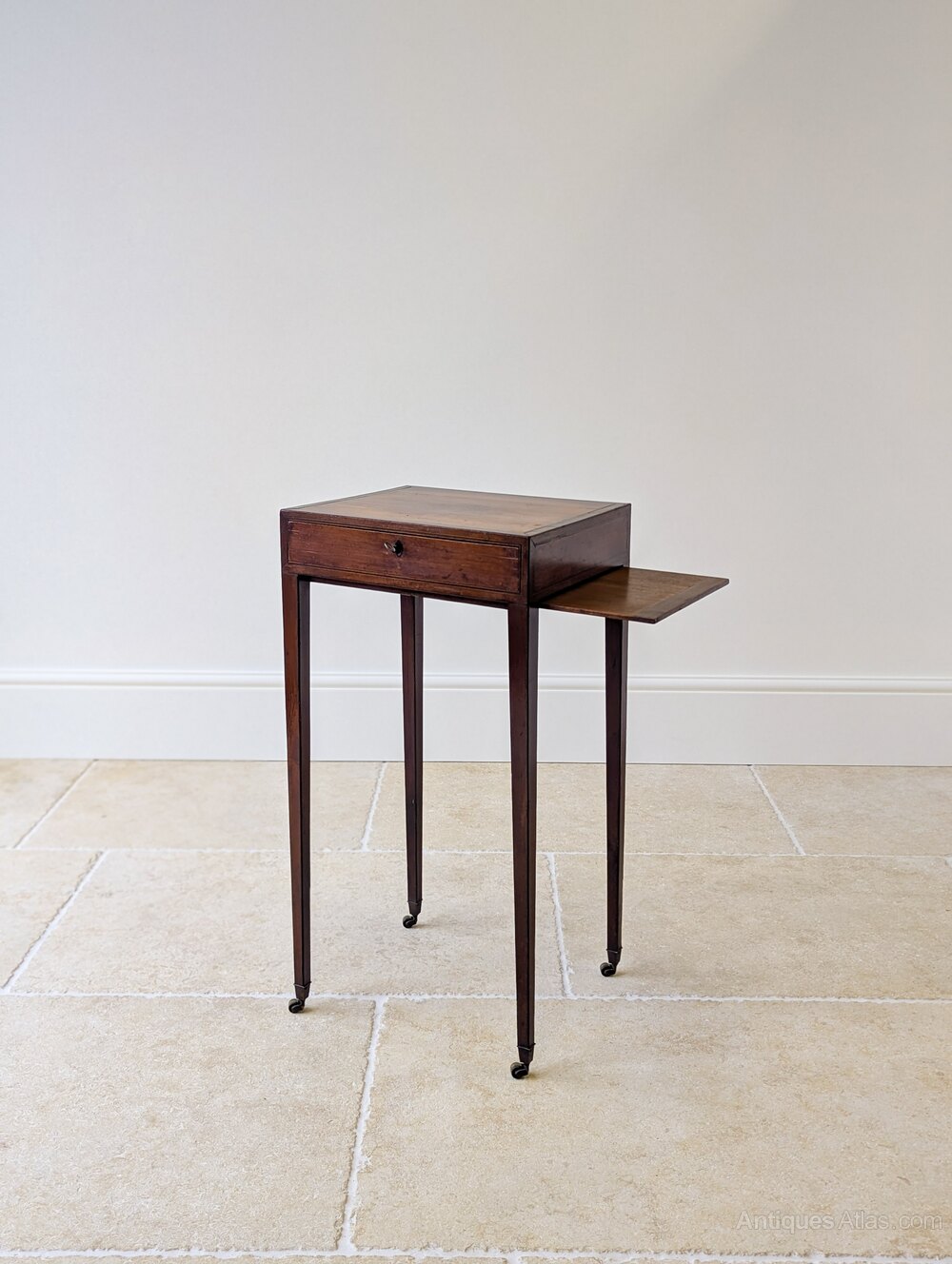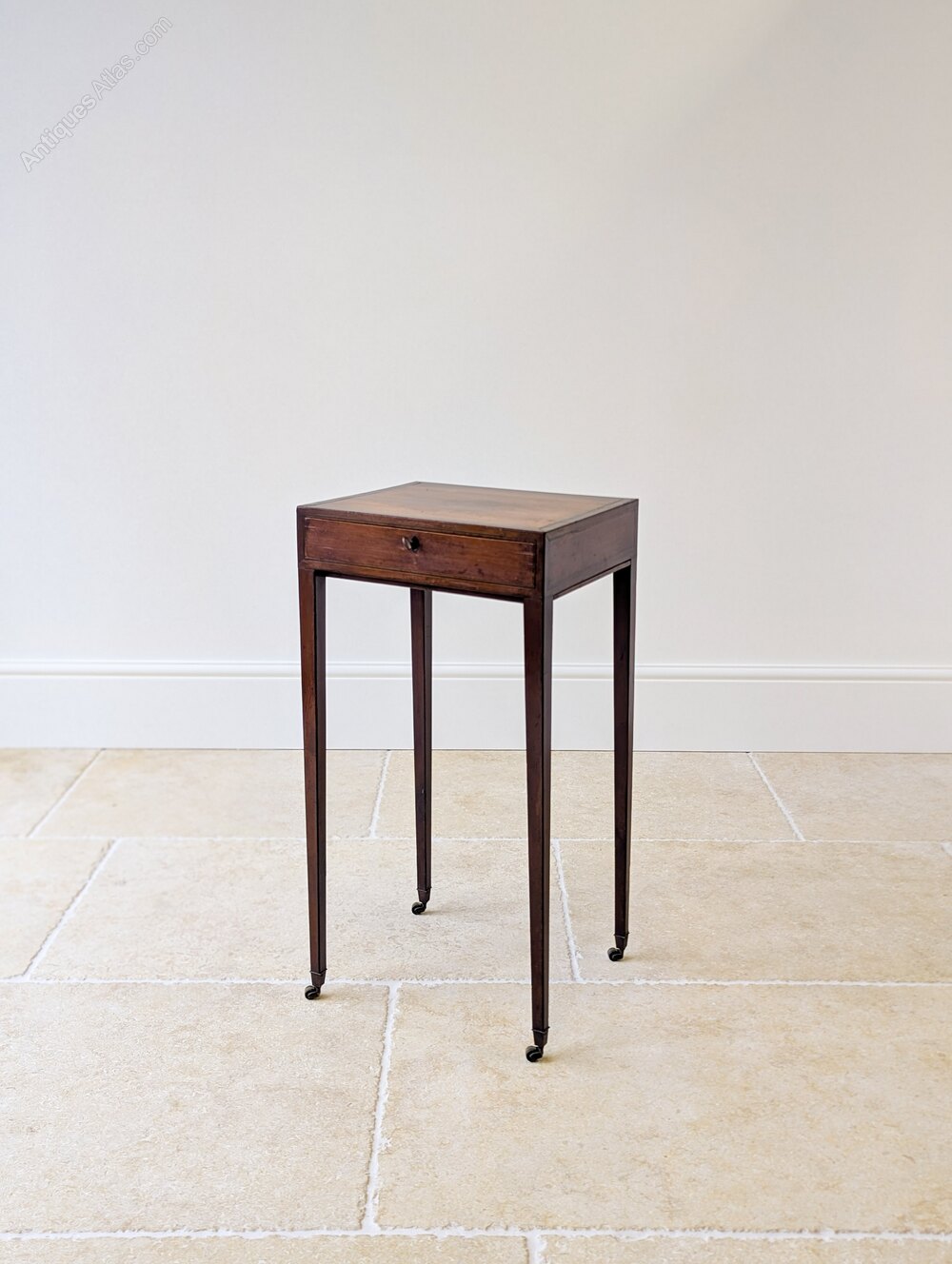 A fine Scottish Regency table, veneered throughout in satin birch and framed with ebonised fruitwood and boxwood banding, and raised on exceptionally slender square-tapered fully veneered legs terminating in its original brass castors. A single shallow drawer sits within the frieze, and below, the original runners retain a reinstated lateral slide, extending the working surface to either side as required.The scale, lightness, construction and mobility are characteristic of early 19th-century Scottish small tables, intended to stand attendant beside a seat for reading, writing or general domestic tasks. The warm golden tone of the satin birch, mellowed under an old polish, reflects a regional preference for native timbers that Scottish cabinetmakers often darkened or contrasted to suit early 19th-century taste.