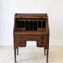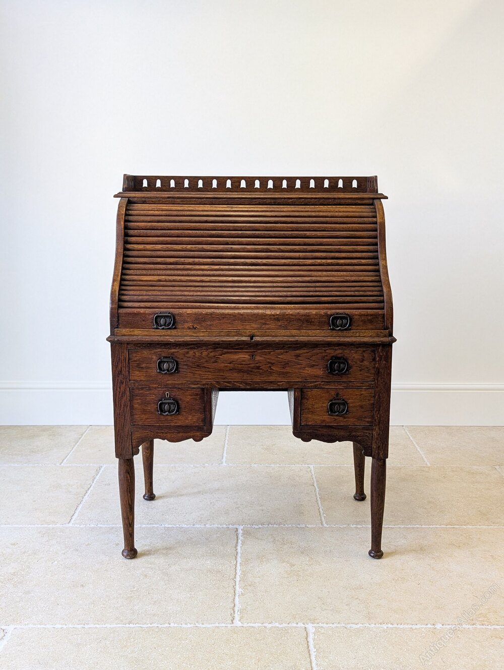 A refined late Victorian oak roll top writing desk of compact domestic scale, featuring a tambour-front upper section enclosing a fitted interior of pigeonholes and small drawers above a pull-out writing surface. The desk is raised on slender baton-turned legs terminating in small ball feet, beneath an arrangement of three drawers around a central kneehole, with a pierced gallery to the top.Constructed in solid oak, with an attractively shaped side profile and subtle Art Nouveau influence, most clearly expressed in the original cast metal drop handles of organic form.