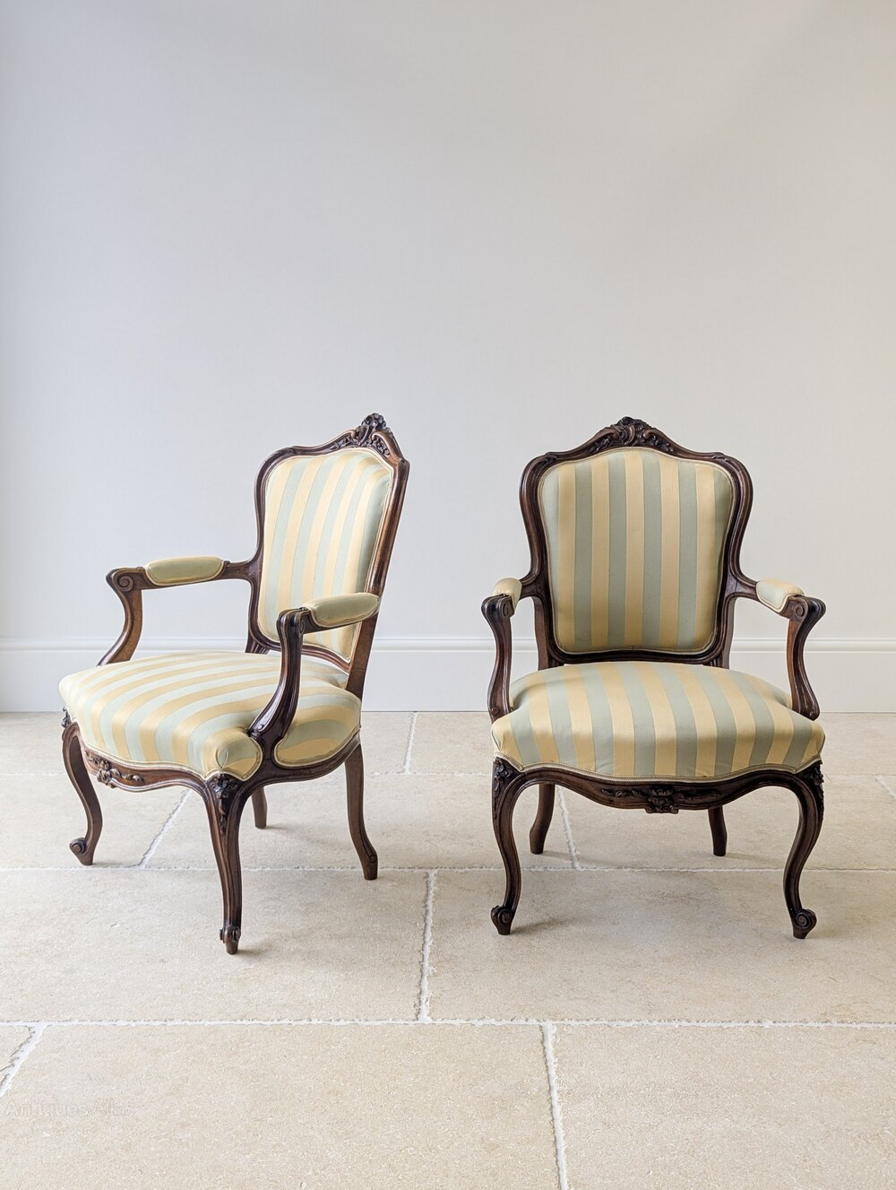 A well-matched pair of late 19th-century walnut open armchairs in the Louis XV style. Each chair is formed with a shaped upholstered back and seat, the back surmounted by a carved crest, with scrolling open arms and padded rests, all raised on carved cabriole legs.Designed as fauteuil-type chairs for occasional seating, they work well as a pair in a drawing room, bedroom or positioned either side of a fireplace.