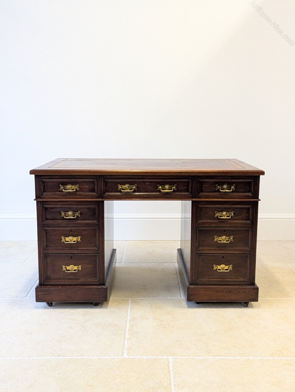 An assured Victorian mahogany pedestal desk with a large inset leather writing surface above a long central frieze drawer, flanked by two pedestals of graduated drawers with original brass handles, all raised on plinth bases with castors.Made for professional office use, combining a generous working space with practical storage, its modest footprint and fully finished back make it suitable for placement either centrally or against a wall within a study or library.