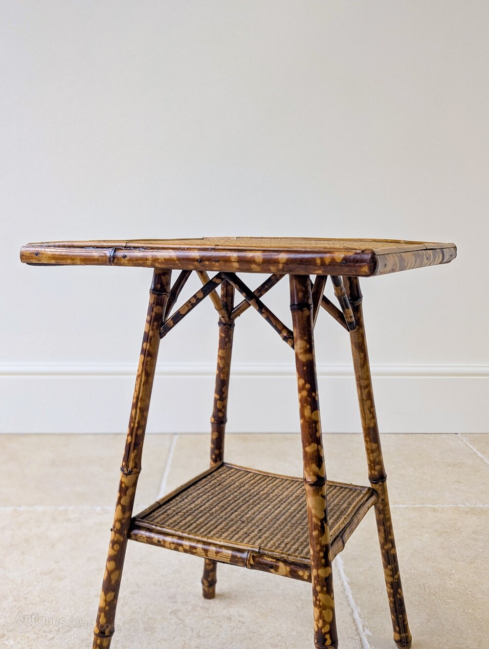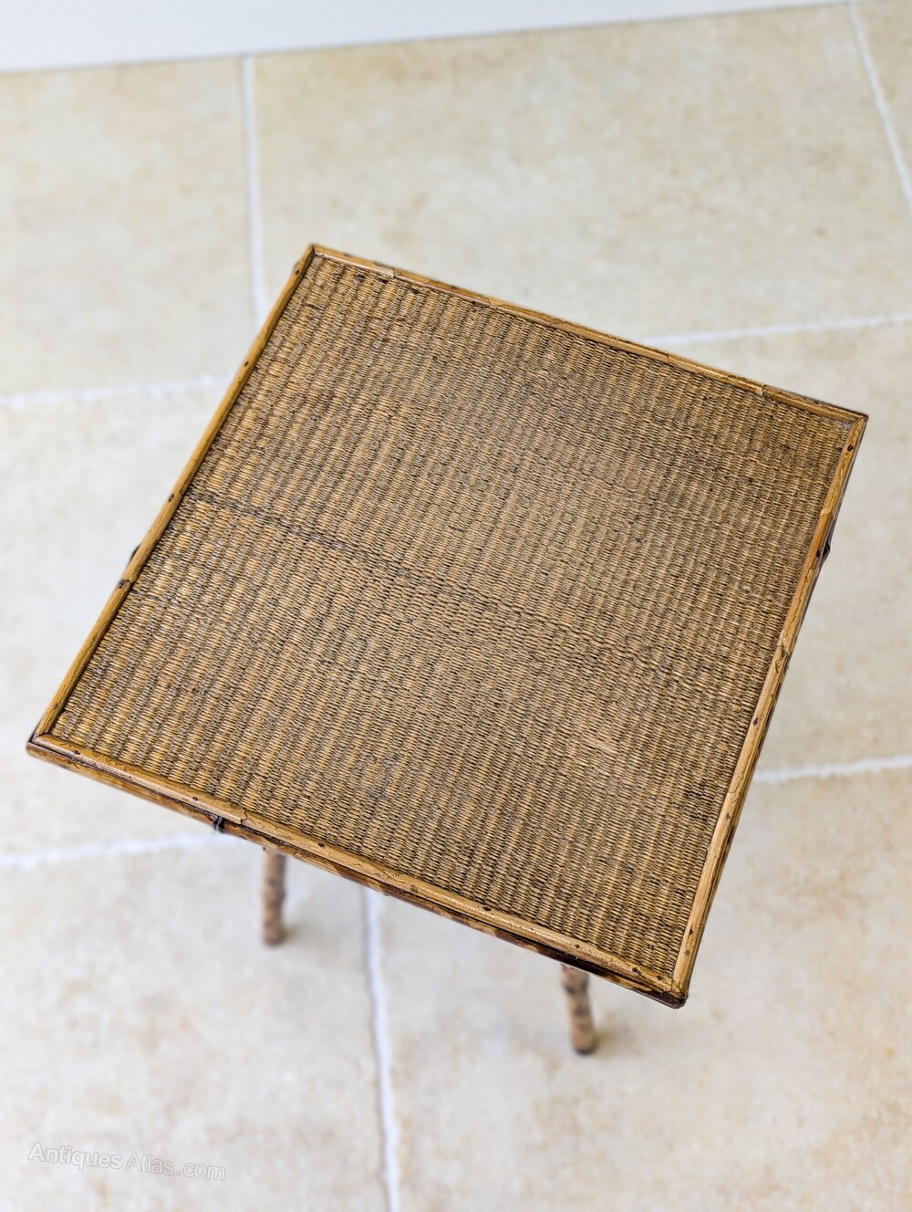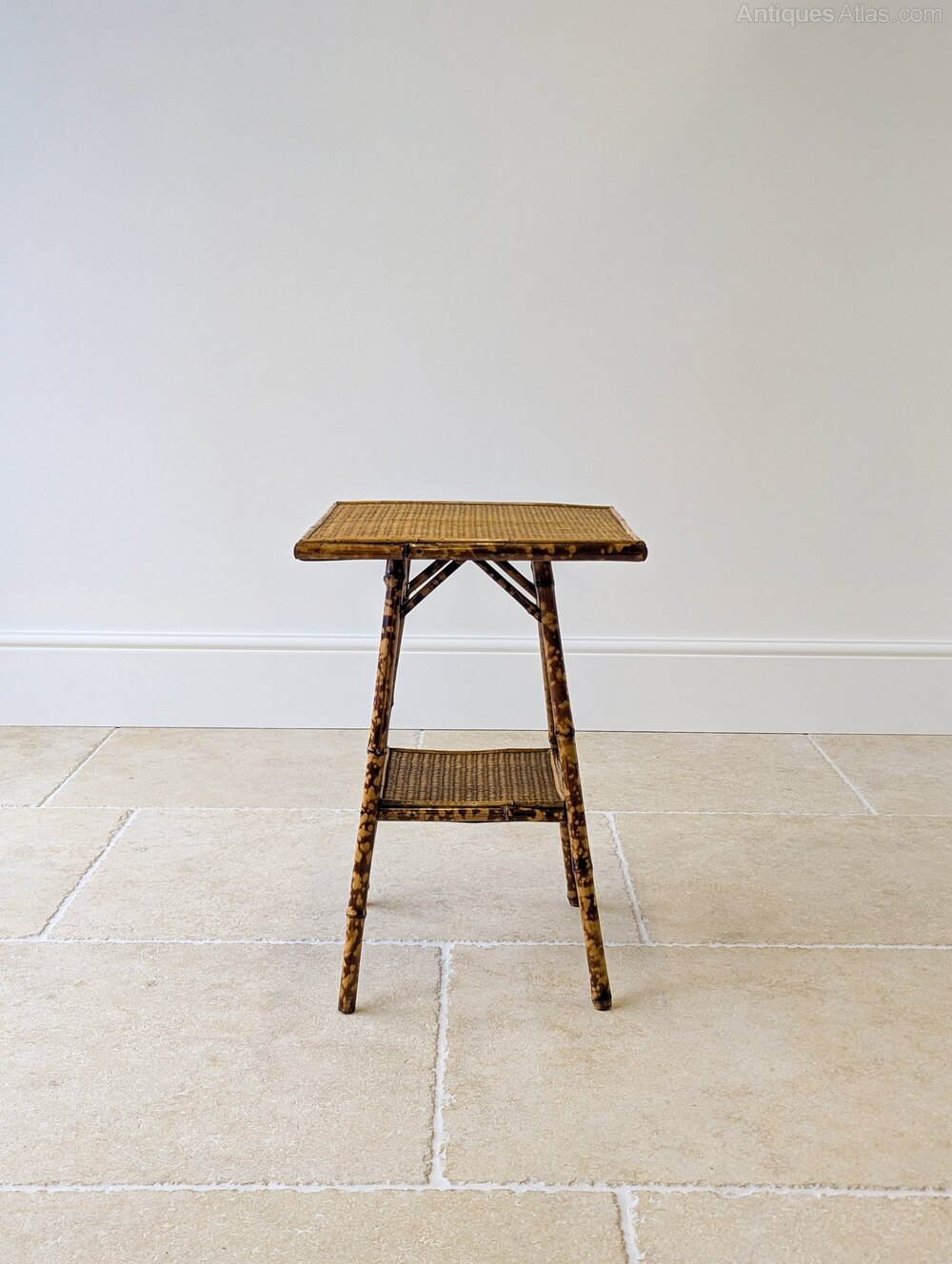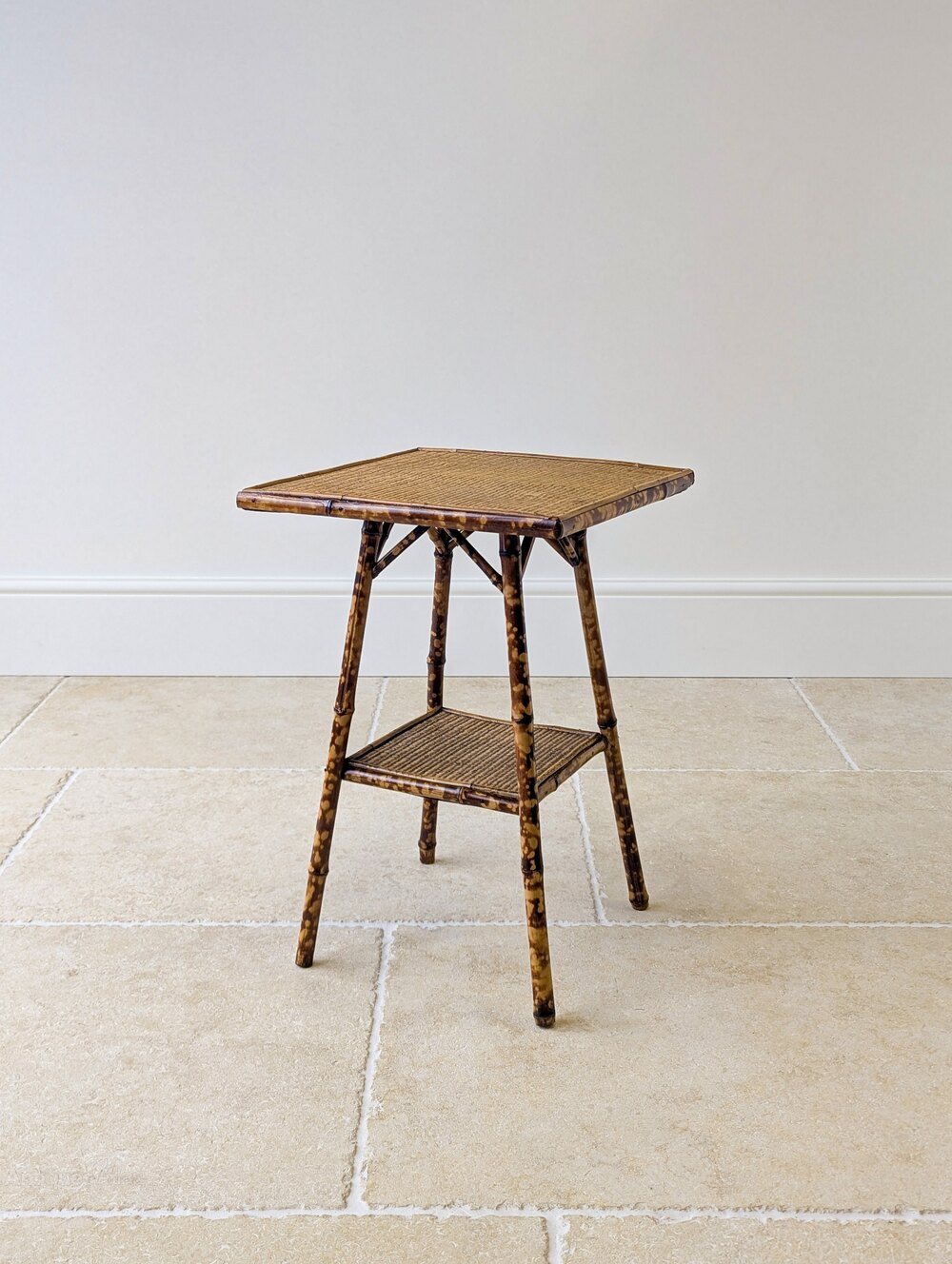 A late Victorian bamboo occasional table of square form, raised on gently splayed legs united by a lower tier and reinforced with typical decorative braces below the tabletop. A good original example with a warm, natural colour, reflecting the Anglo-Japanese influence that shaped the Aesthetic Movement in the closing years of the 19th century.Very good antique condition with only some minor surface wear consistent with age and use. Structurally all in good order, clean and ready to place in the home.