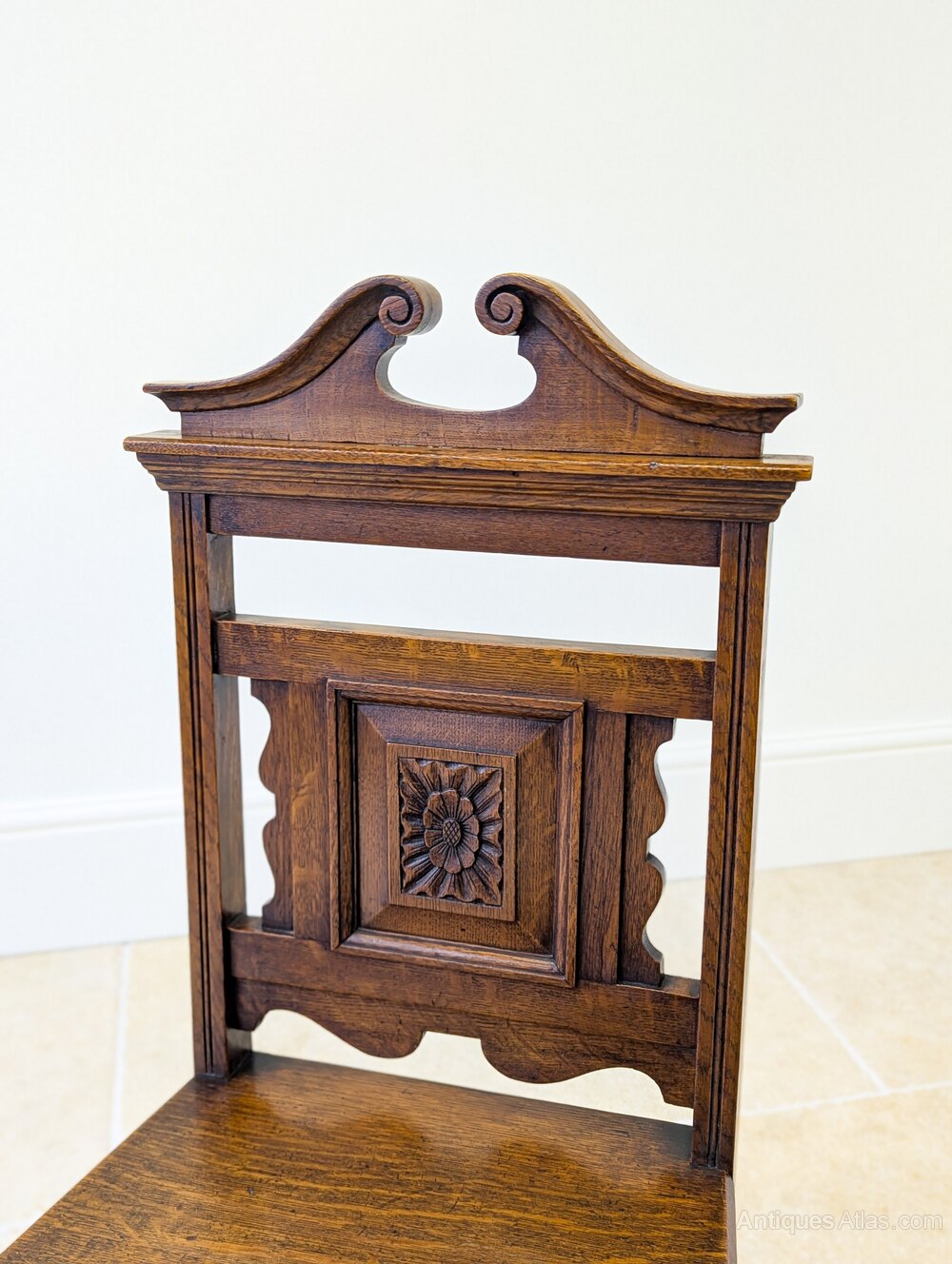 A late Victorian oak hall chair with an attractive upright framed back, surmounted by a scrolled crest rail and centred by a fielded panel carved with floral rosette. The single piece solid plank seat has gently softened edges and is raised on ring-turned front legs.A decorative chair intended for occasional sitting or perching in a hall or landing, it also works well as an accent chair in a bedroom or study.