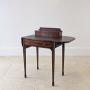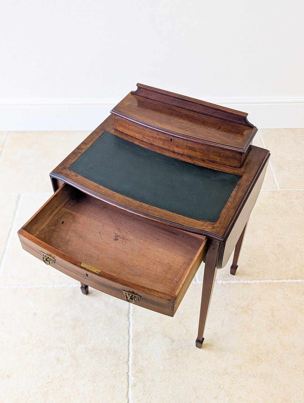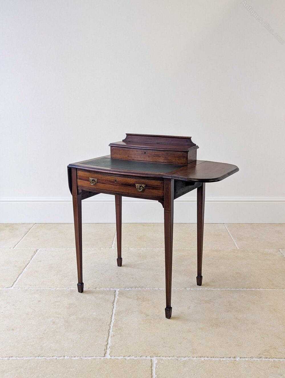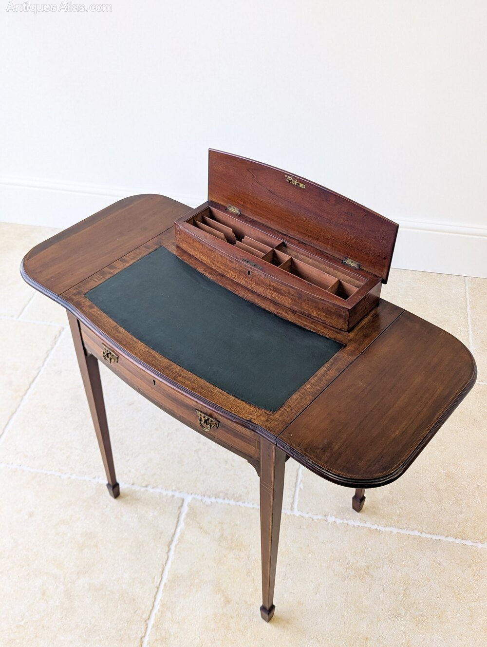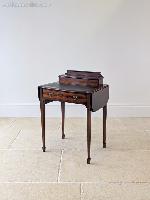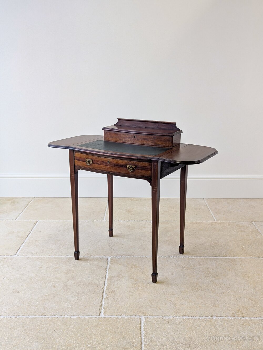 A fine Edwardian mahogany writing table with rising side leaves and inset writing surface above a single frieze drawer fitted with original brass swan-neck handles, all raised on tapering square legs with fine string inlay and spade feet. To the rear of the table is a fitted stationery superstructure with shaped gallery back, crossbanded lid and internal divisions.Compact in scale yet the raised leaves create a generous working surface, while the fitted stationery compartment and lower drawer provide ample storage. Equally at home in a bedroom or living space as it is a study.