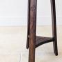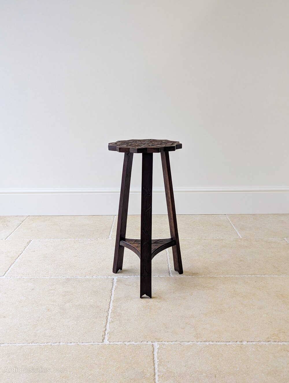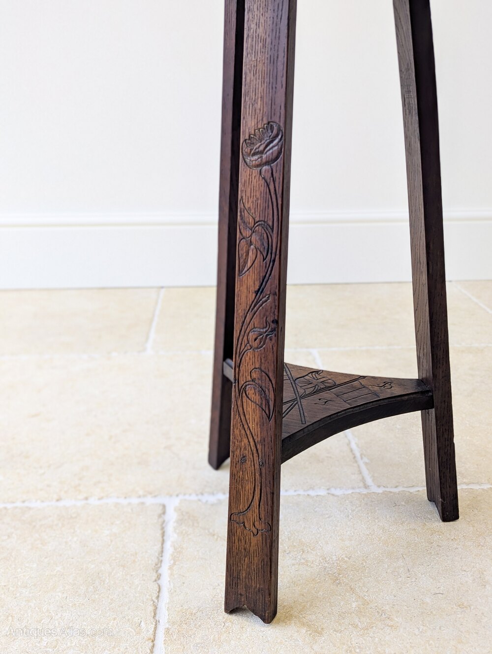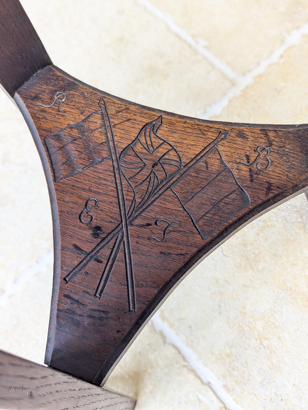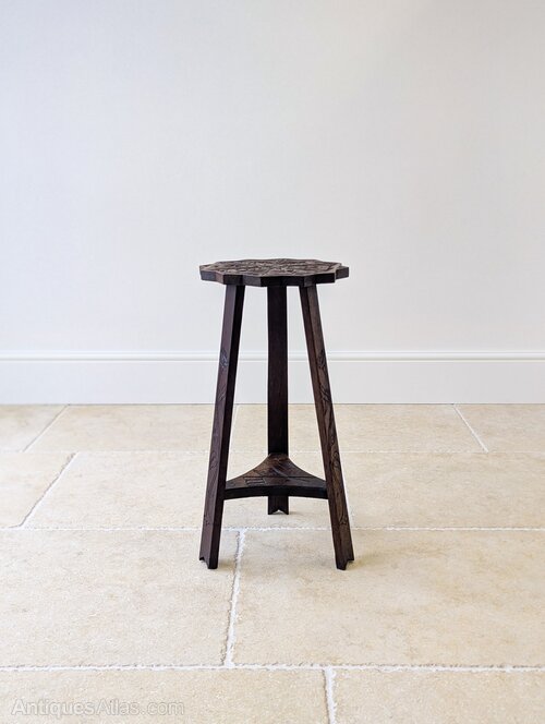 An early 20th century oak tripod occasional table, with an attractively shaped top carved in bold foliate relief centred by a small cross, set over three splayed legs, each incised with a single poppy, united by a shaped undertier carved with crossed Allied flags and lettering.Made in the years following the First World War, the combination of Allied flags, poppy carving and central cross clearly marks it as a commemorative piece, its restrained form and hand-cut detail reflecting strong Arts and Crafts influence.