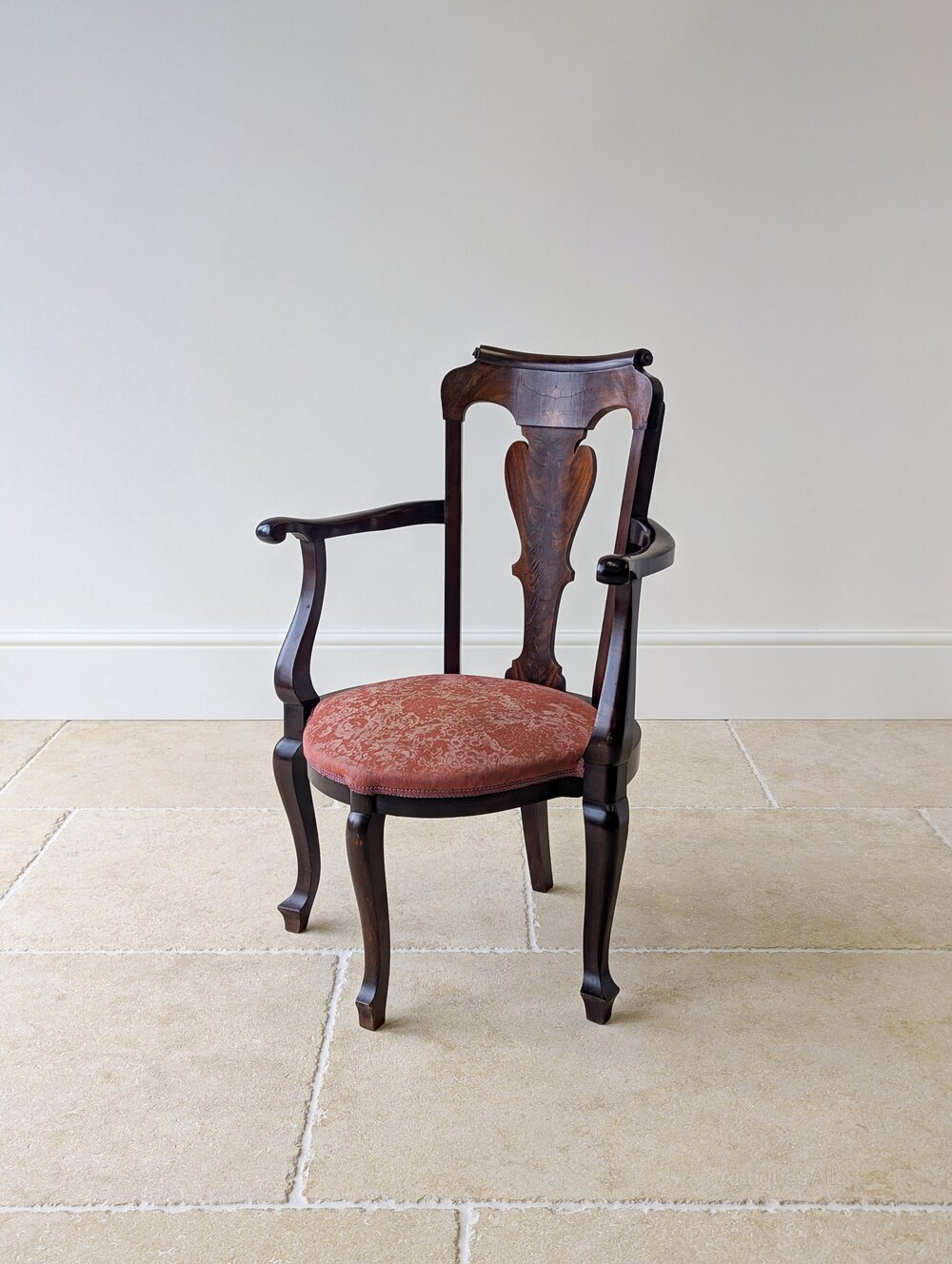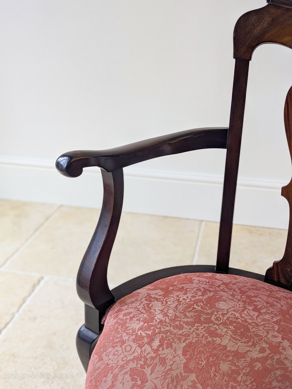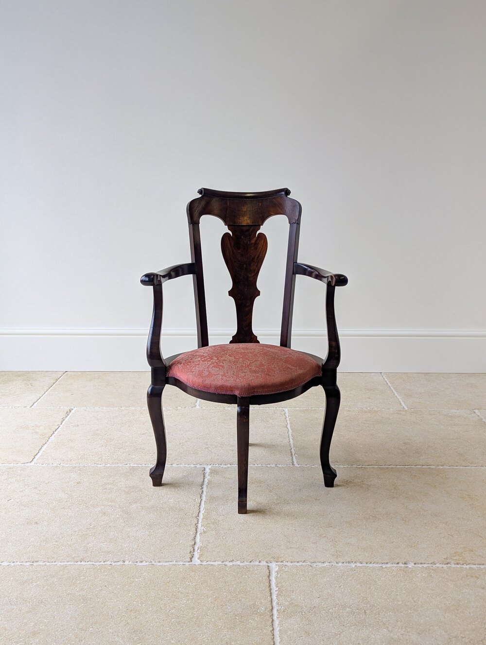 A fine George II mahogany open armchair, the back with an attractively scrolled crest rail and shaped splat, framed by outscrolled arms. Upholstered in a muted rouge floral damask, the seat is raised on cabriole legs arranged with a single central front leg, midpoint side legs and a single rear support.Well suited to use with a low 18th century writing table or small desk, and equally effective as an occasional chair in a drawing room or study.