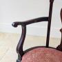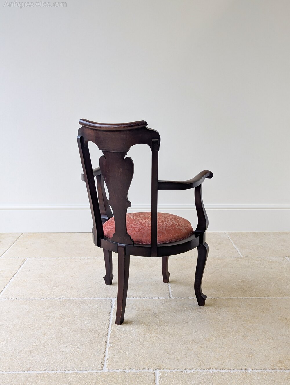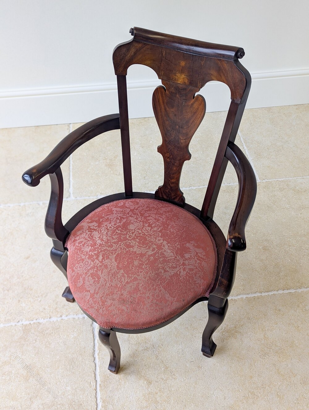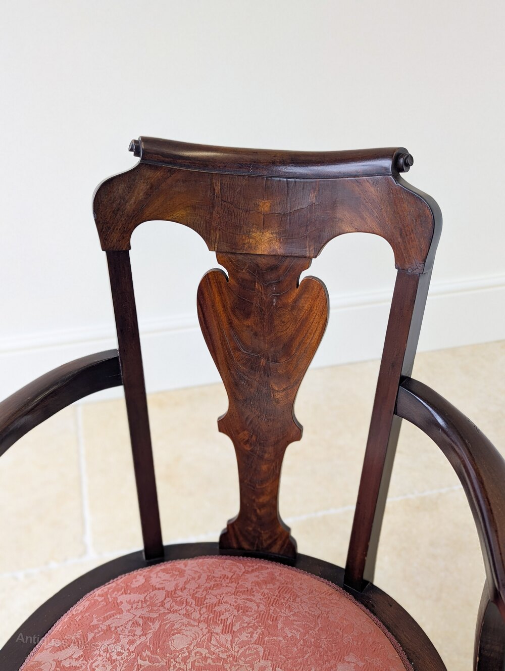 A fine George II mahogany open armchair, the back with an attractively scrolled crest rail and shaped splat, framed by outscrolled arms. Upholstered in a muted rouge floral damask, the seat is raised on cabriole legs arranged with a single central front leg, midpoint side legs and a single rear support.Well suited to use with a low 18th century writing table or small desk, and equally effective as an occasional chair in a drawing room or study.
