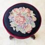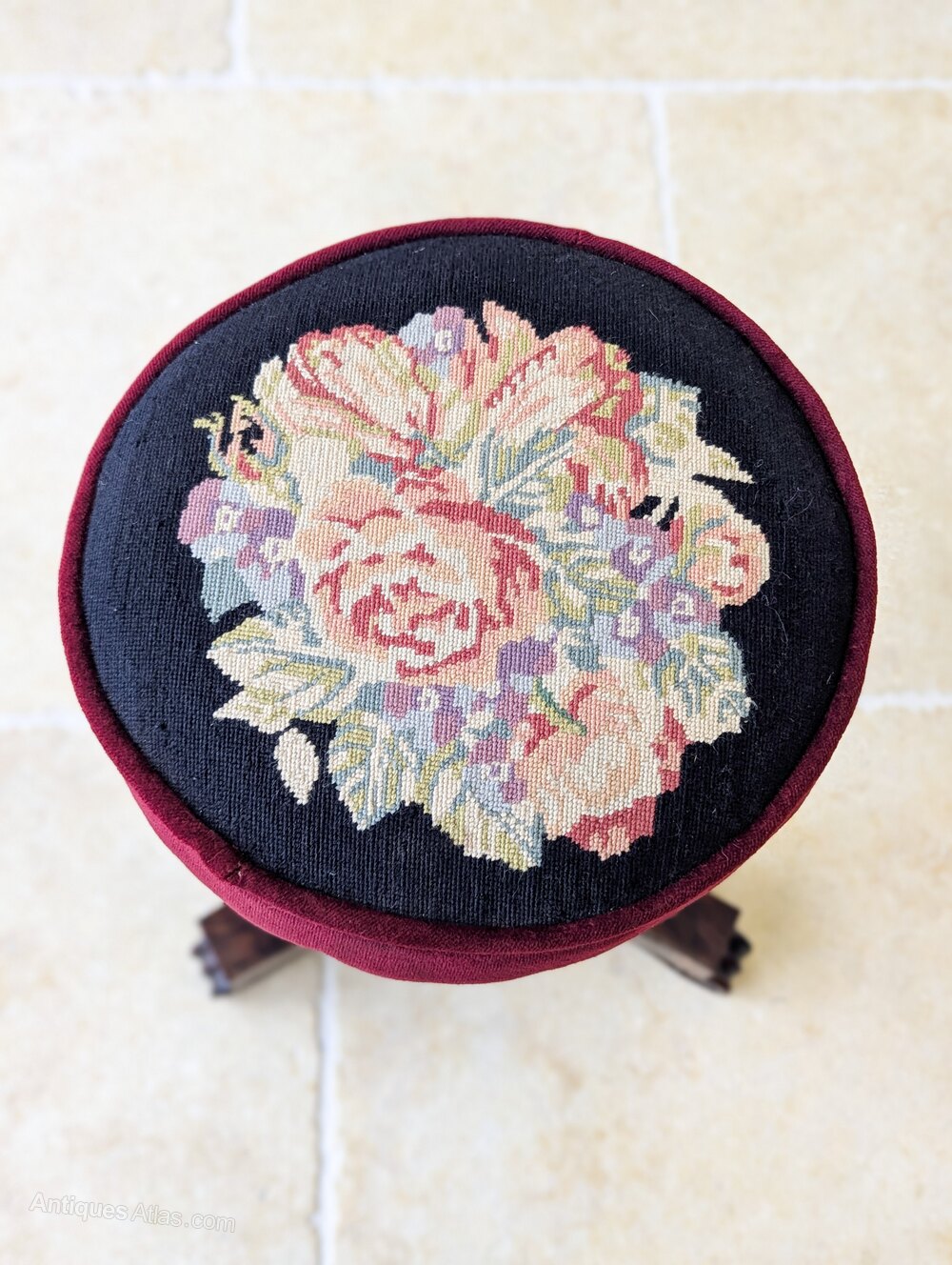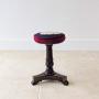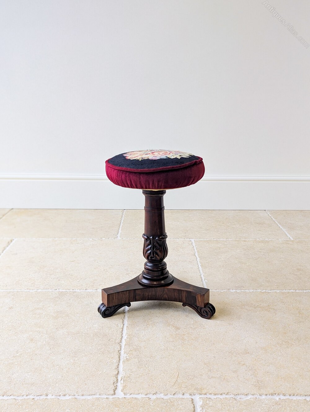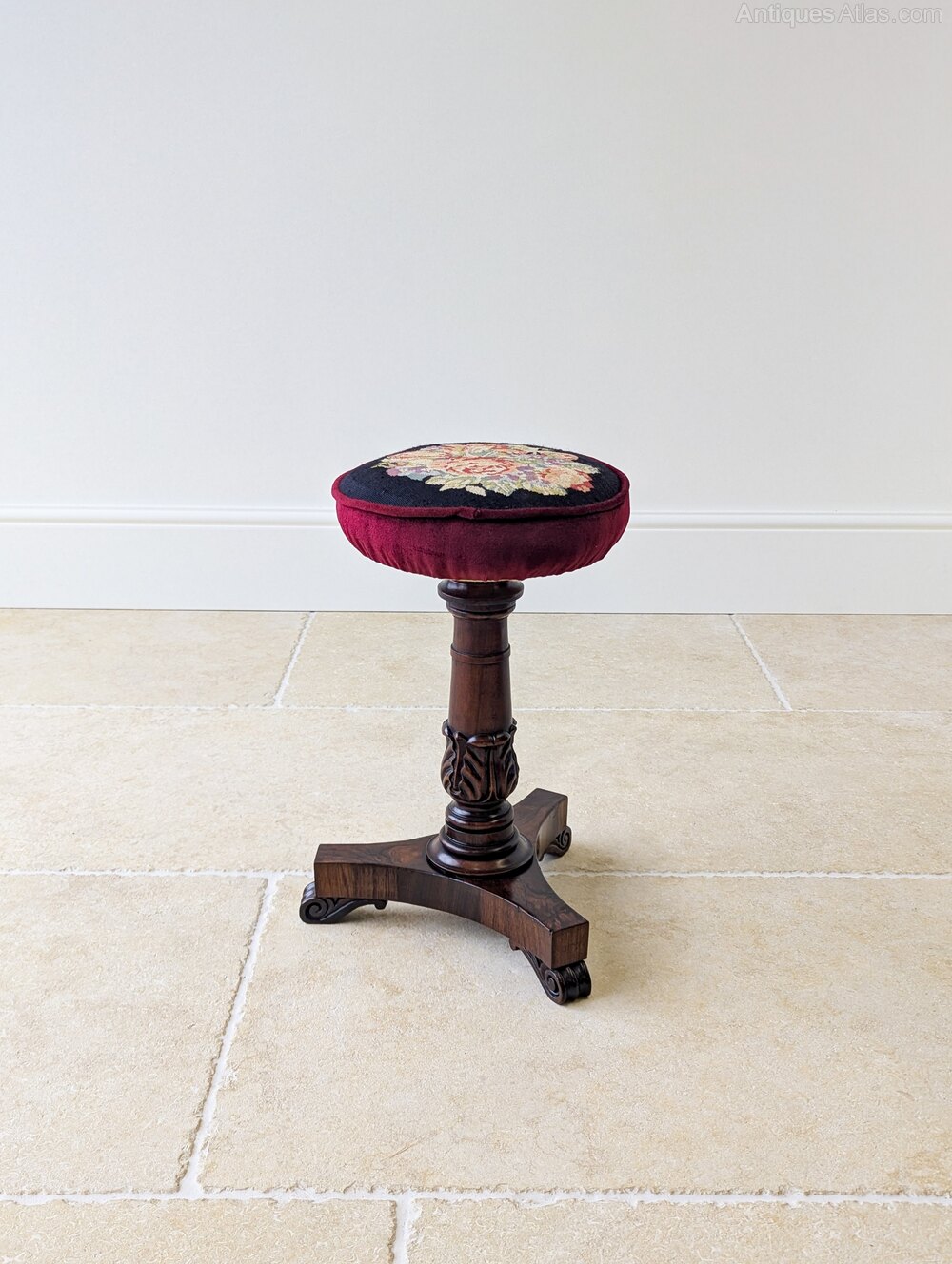 A William IV rosewood adjustable piano stool, the circular needlework seat within a deep burgundy velvet surround, raised on a turned and carved pedestal with a thick brass adjustable column, atop a tripod base with scroll-carved feet.Ideal for use as intended at a piano, but also particularly useful today as a dressing table stool, or as a decorative occasional stool in a sitting room.
