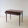 A George III mahogany side table with a well-figured single plank top set over three frieze drawers with decorative brass drop handles, all raised on slender tapering square legs.A handsome late Georgian table well suited for use in a living space or hall, but now also particularly useful as a small writing table in a bedroom or study.