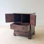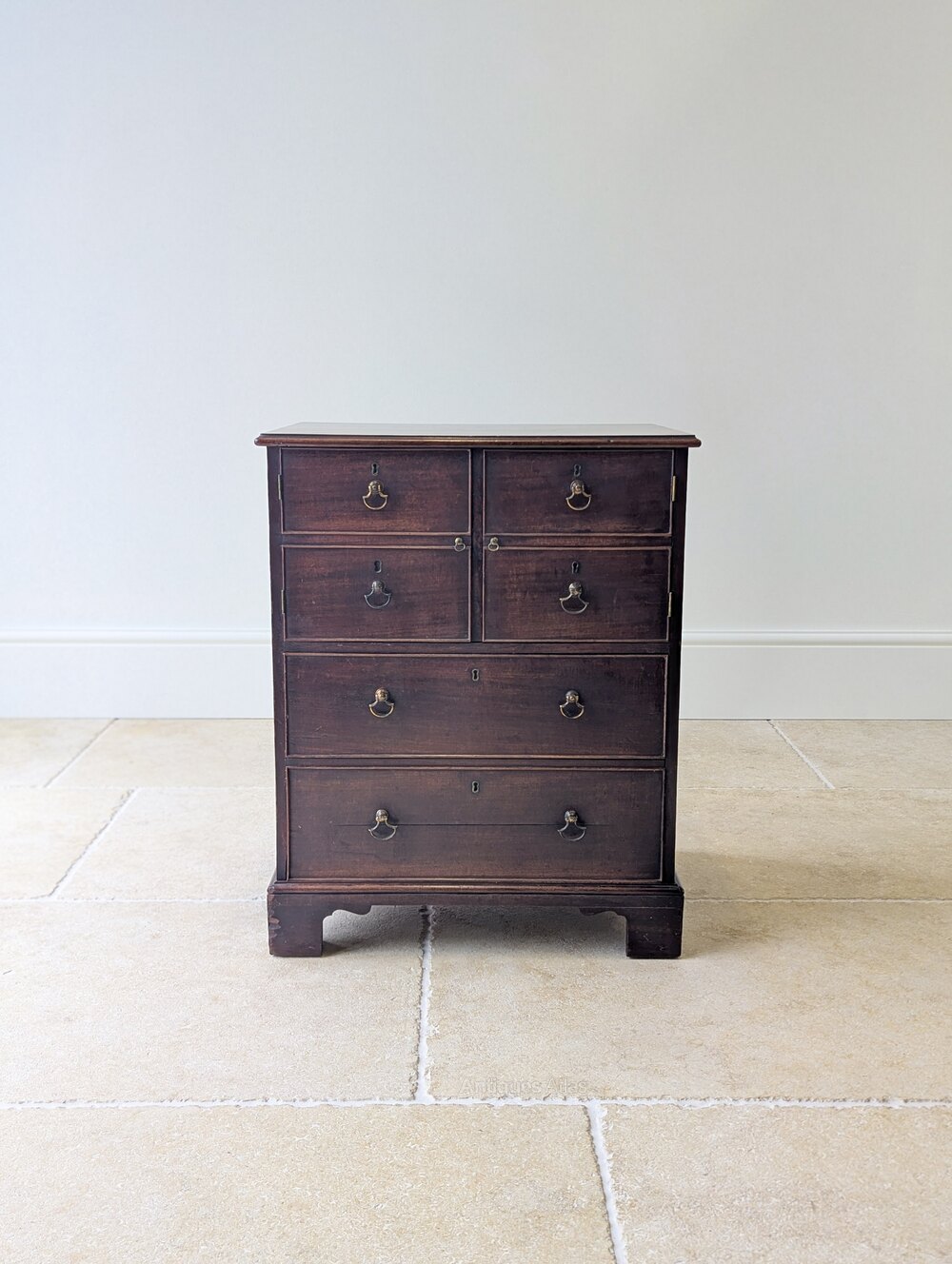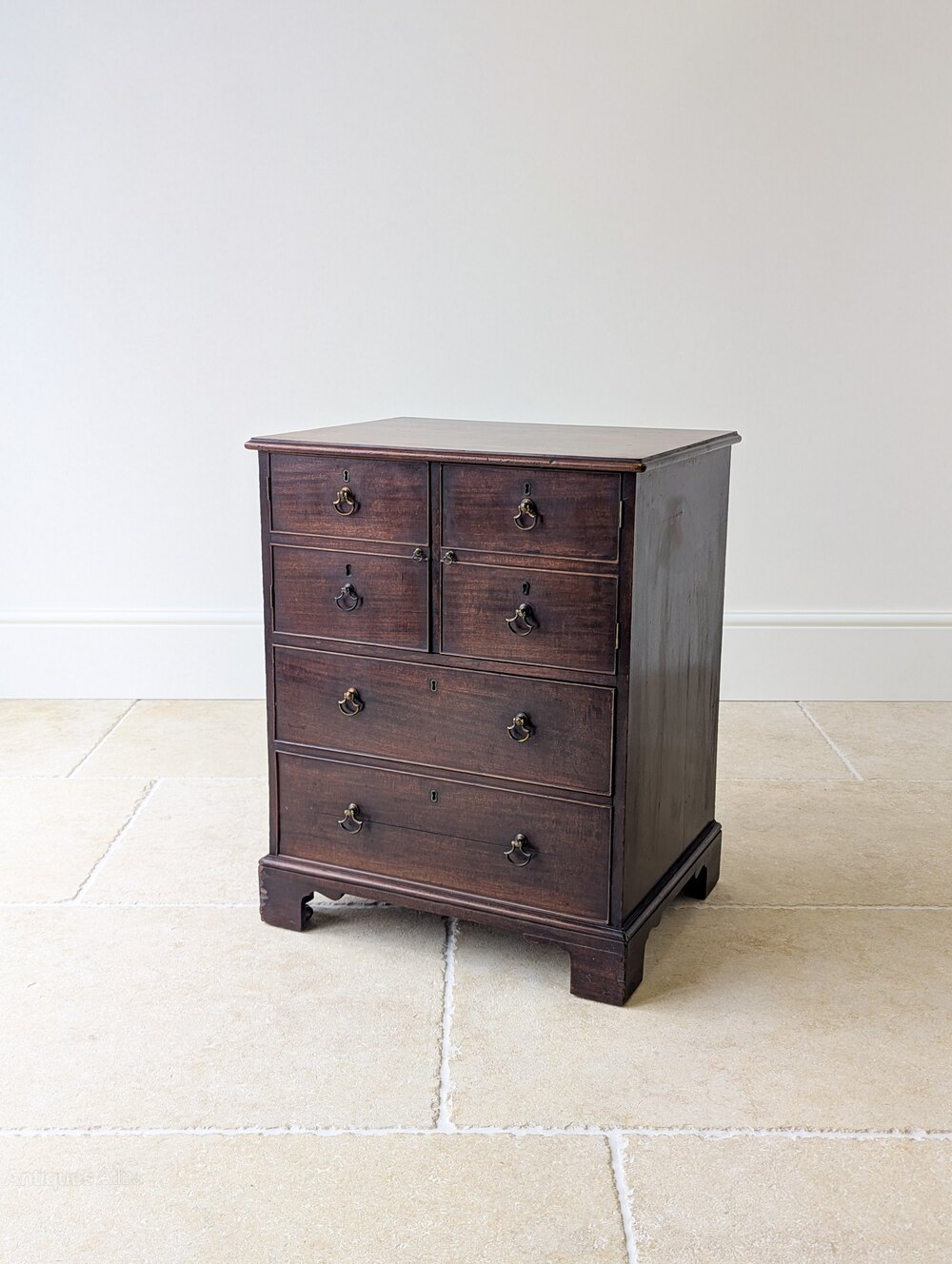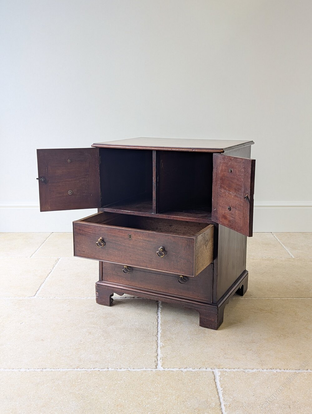 A George III mahogany commode chest, the solid top with moulded edge above a pair of cupboard doors enclosing a divided interior, set over one working drawer and one false drawer with a concealed storage void behind, all raised on bracket feet with concealed brass castors.An attractive and practical piece, later converted and now offering practical storage in a compact footprint. It would work well as a bedside cupboard, in a dressing room or in a hall where a small, useful piece abundant in character is needed.
