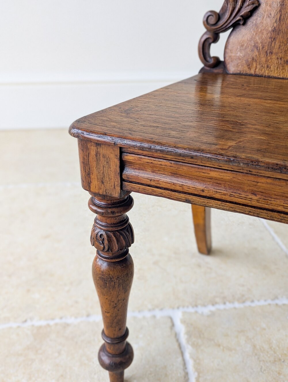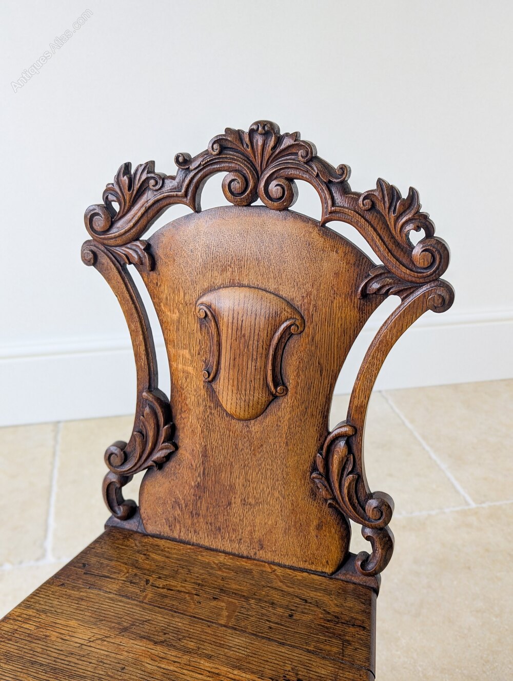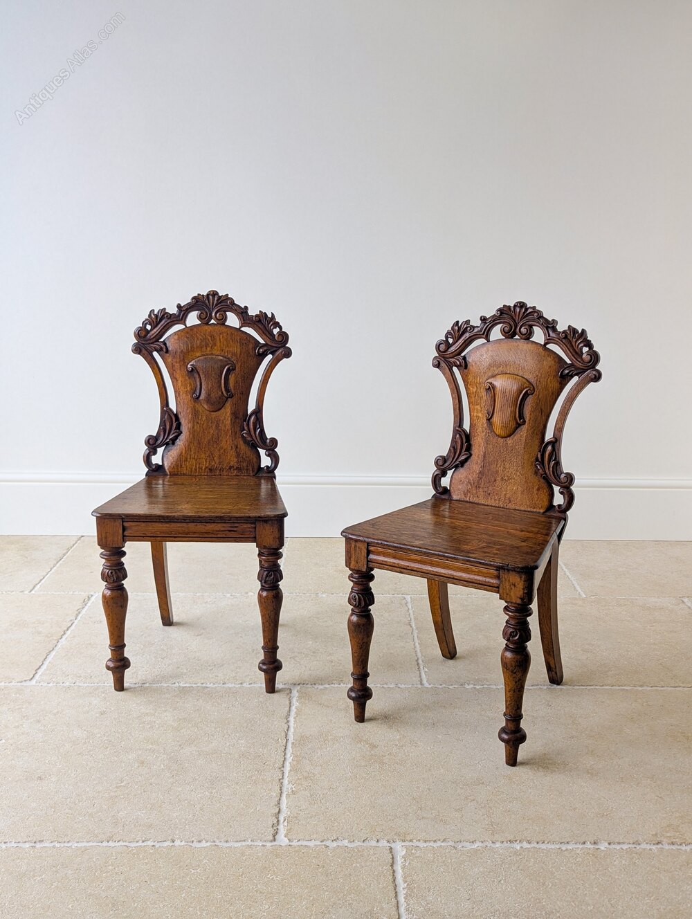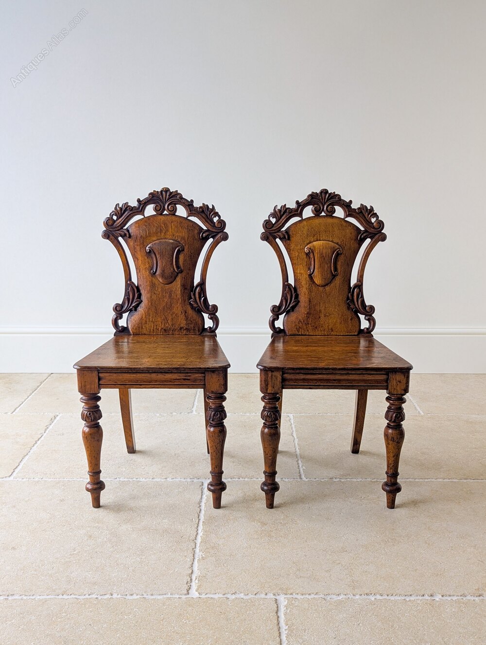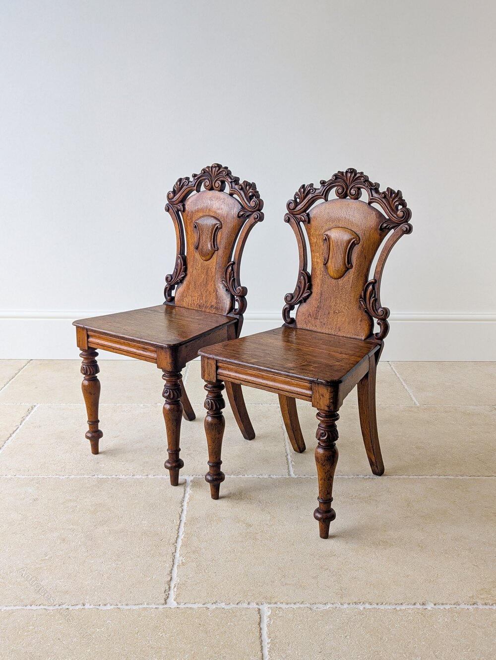 An attractive pair of mid Victorian oak hall chairs, the solid backs finely shaped and richly carved with foliate decoration and shield-form cartouches, set over plain seats and raised on turned front legs with carved collars.Very good antique condition with some surface wear and a well developed patina in keeping with use. Structurally sound, clean and ready to place.