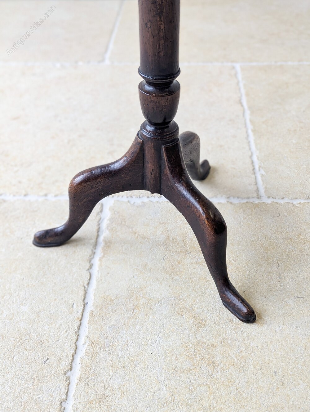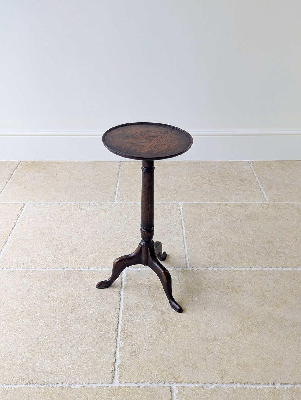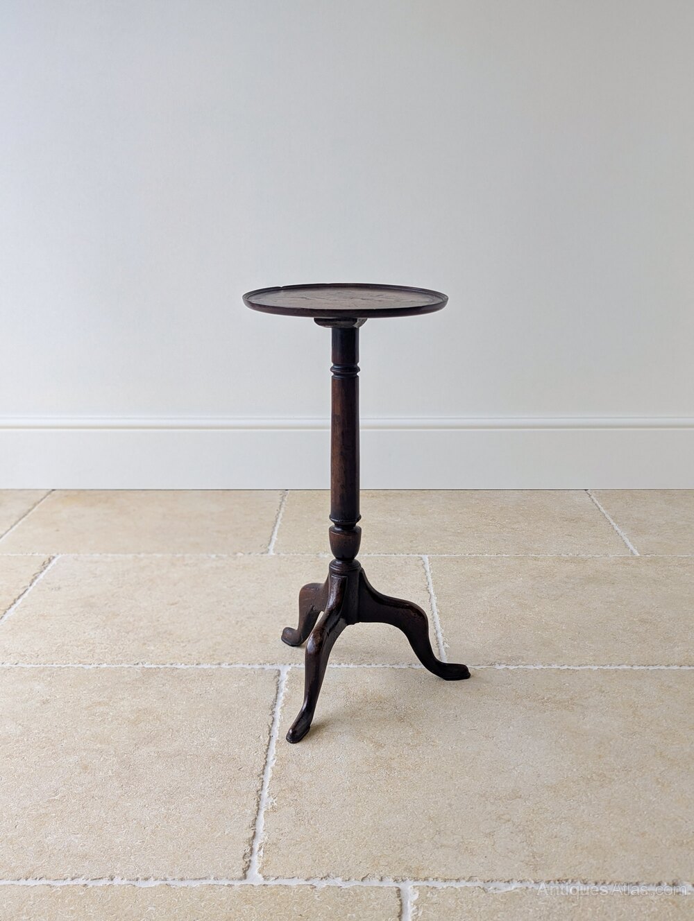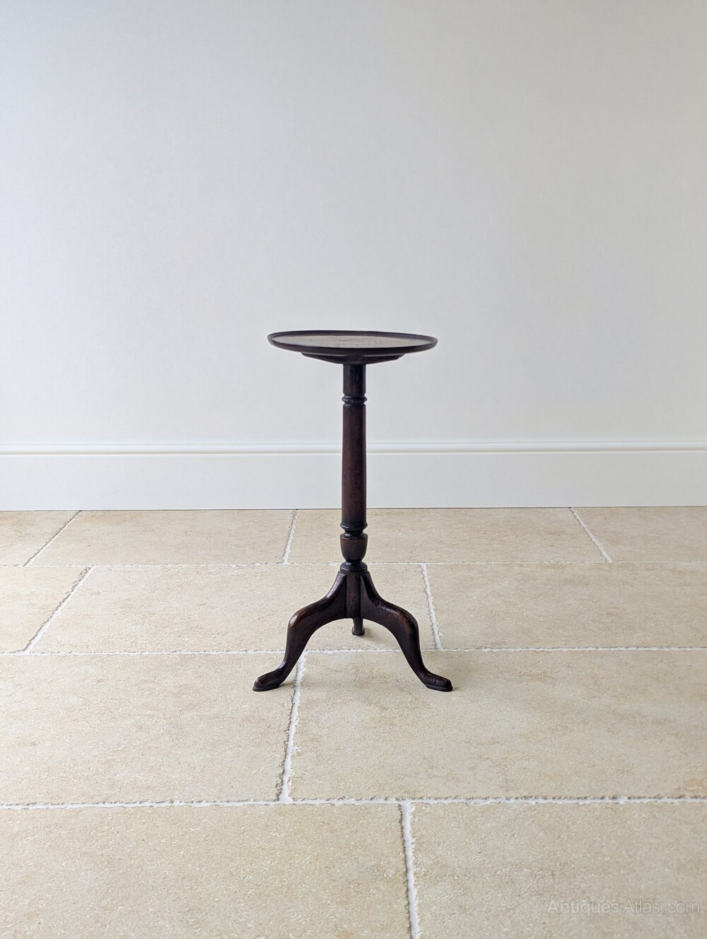 A Georgian mahogany tripod wine table, with a circular dished top set over a slender turned column with restrained baluster detail, above a well-shaped tripod base of cabriole legs terminating in pad feet.Very good antique condition with lots of honest surface wear, an attractive age-related patina and a small stable split to the top consistent with age and use. Structurally sound, clean and ready to place in the home.