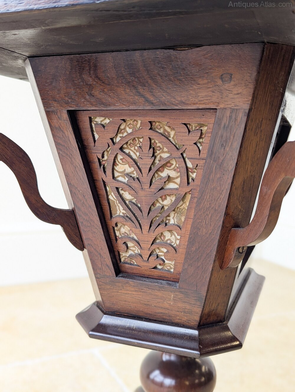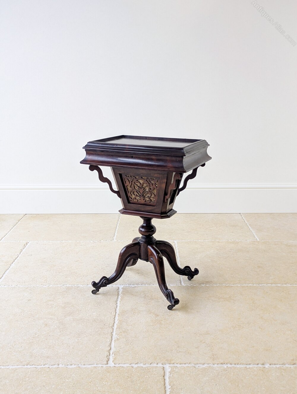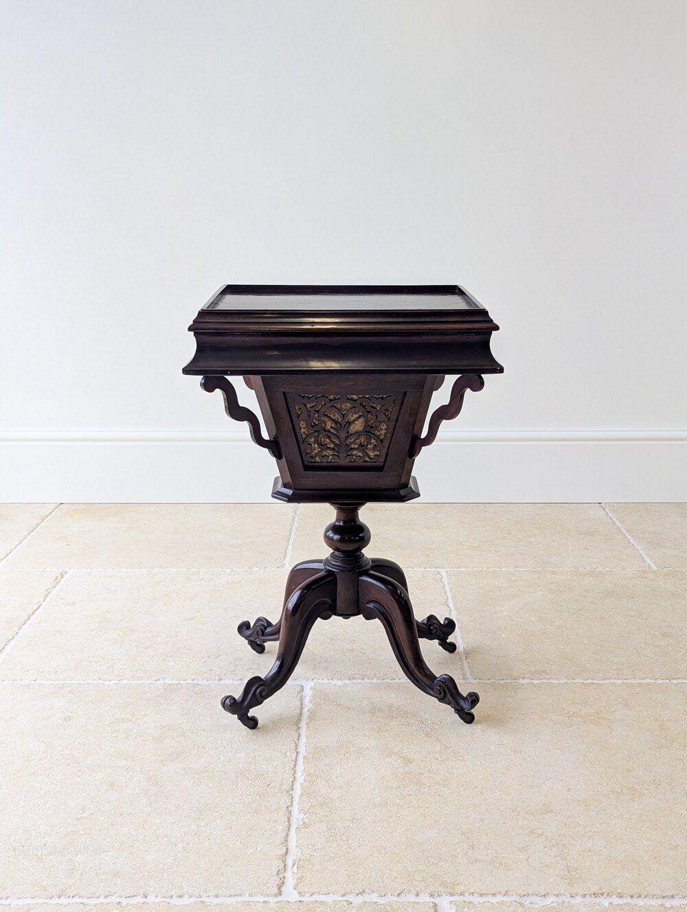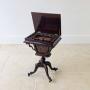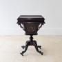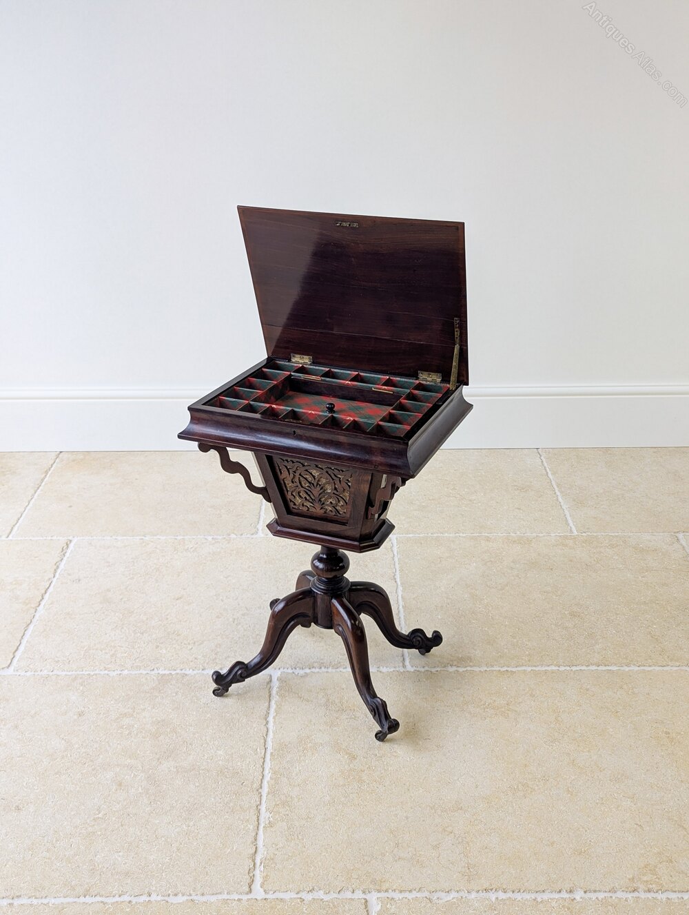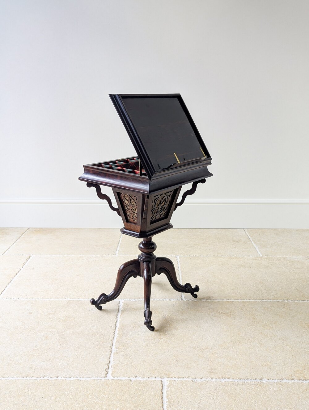 An early Victorian rosewood sewing and reading table, the hinged top enclosing a fully fitted interior with compartmentalised storage and a central covered well. When opened the top forms a useful reading slope, the original adjustable brass stay allowing the top to be angled as required and the removable book rest (neatly housed inside when not in use) can be fitted into position.Below, a trumpet-shaped body with fret carved panels to all sides and decoratively shaped supports sits atop a turned pedestal raised on well-carved cabriole legs terminating in brass castors.