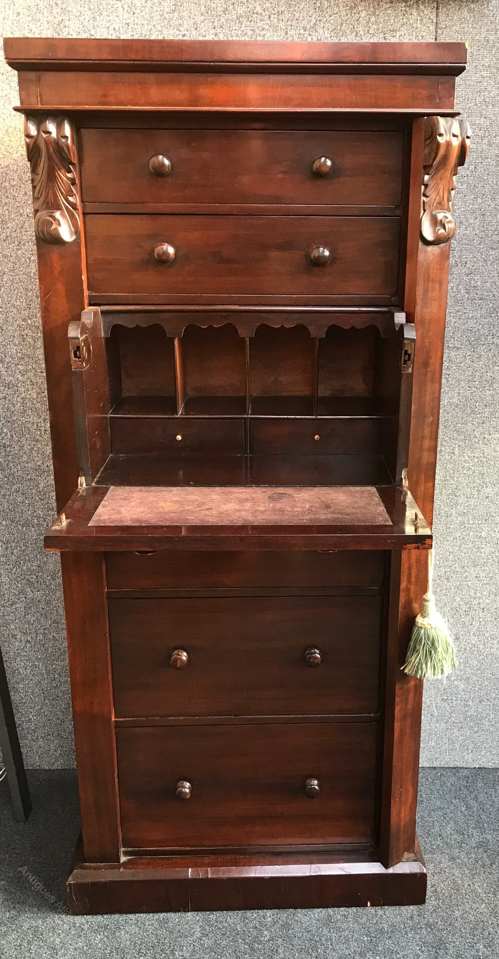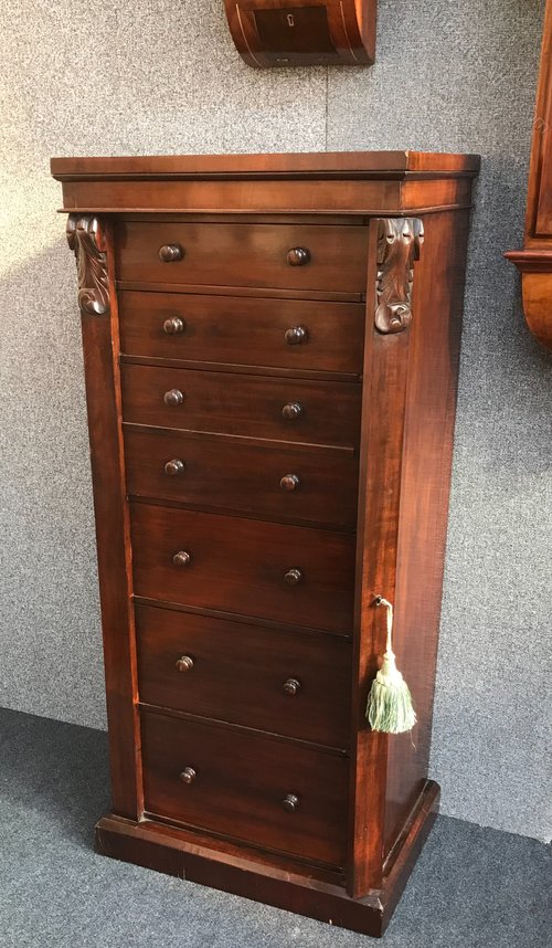 Most useful and decorative Secretaire Wellington chest, circa 1880, the fall front opening to reveal drawers and pigeonholes. Ht 127, Wd 55, 40 cms.Frank Craig Antiques established 1972, with 50 years in the antique trade. Our experience ensures that we only select the best pieces in their category. We offer our customers a reliable service, with the assurance that all our stock is thoroughly vetted as genuine antique and sold at the best possible price point. All items are sold without restoration or a minimum if required and will be in a condition commensurate with age. We can arrange deliveries to any destination. If a purchase is returned for any reason, any incurred shipping charges will be the liability of the buyer. for further items of interest please visit our website