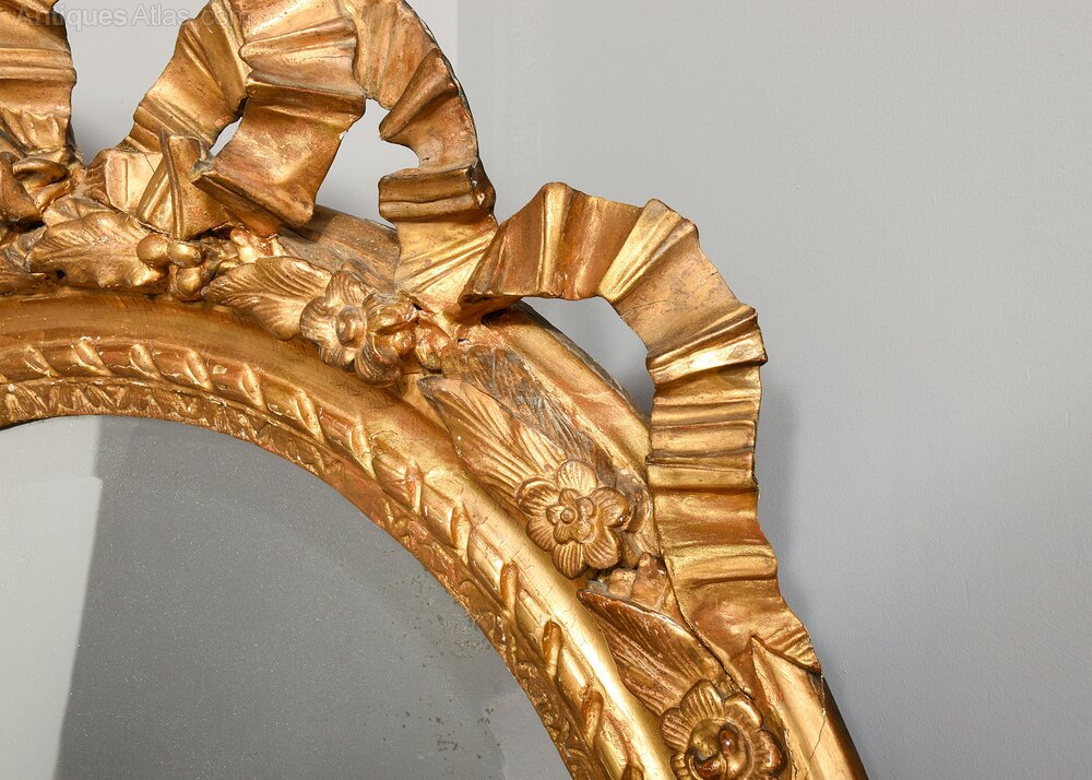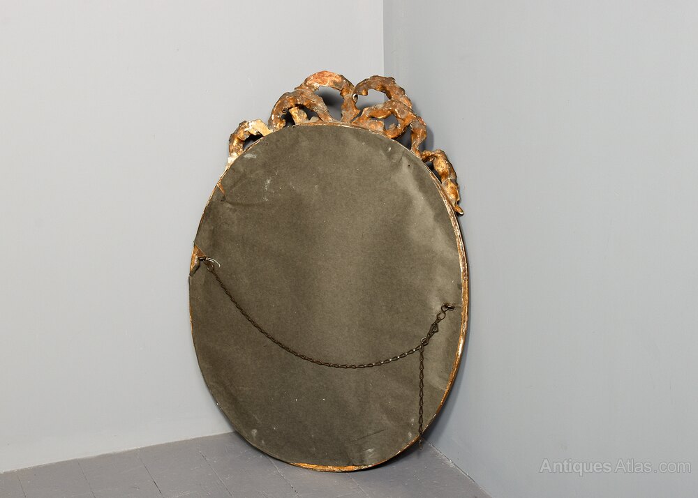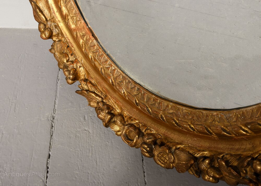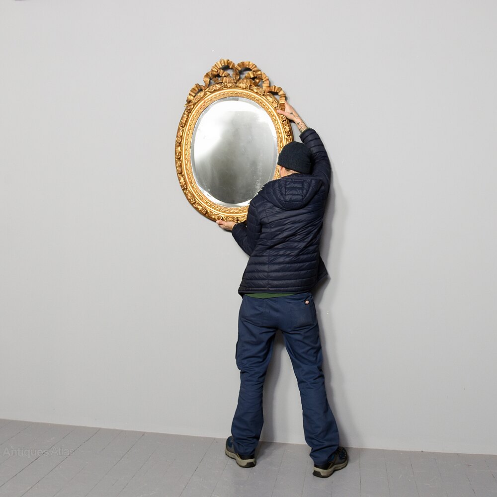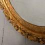 Circa 1850. An early Victorian carved and gilded oval mirror. The top is surmounted with gilded ribbon forming a bow and trailing to the sides, the outer edge of the frame with profusely carved acorns, leaves, berries and flower-heads with other concave, gilded and carved sections, retaining its original oval bevel edge mirror with some slight speckling. All in excellent condition.99cm High x 75cm Wide,
