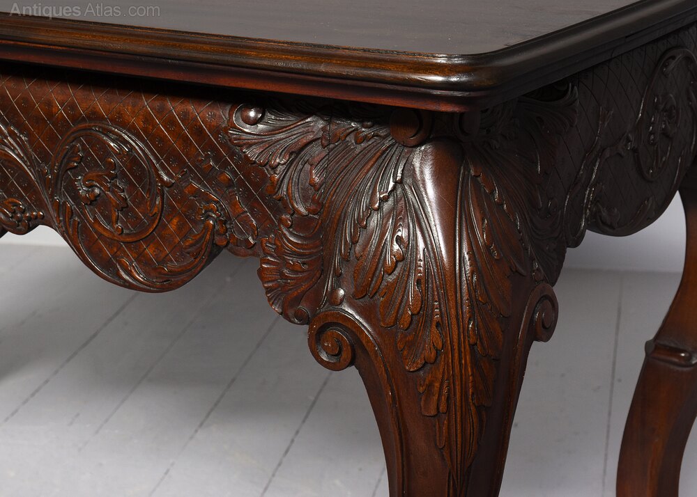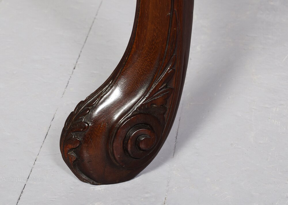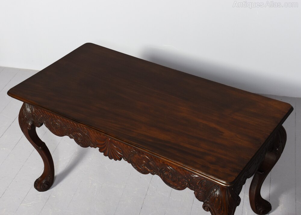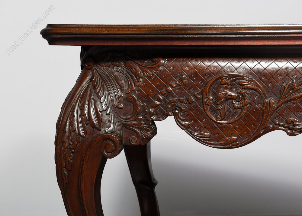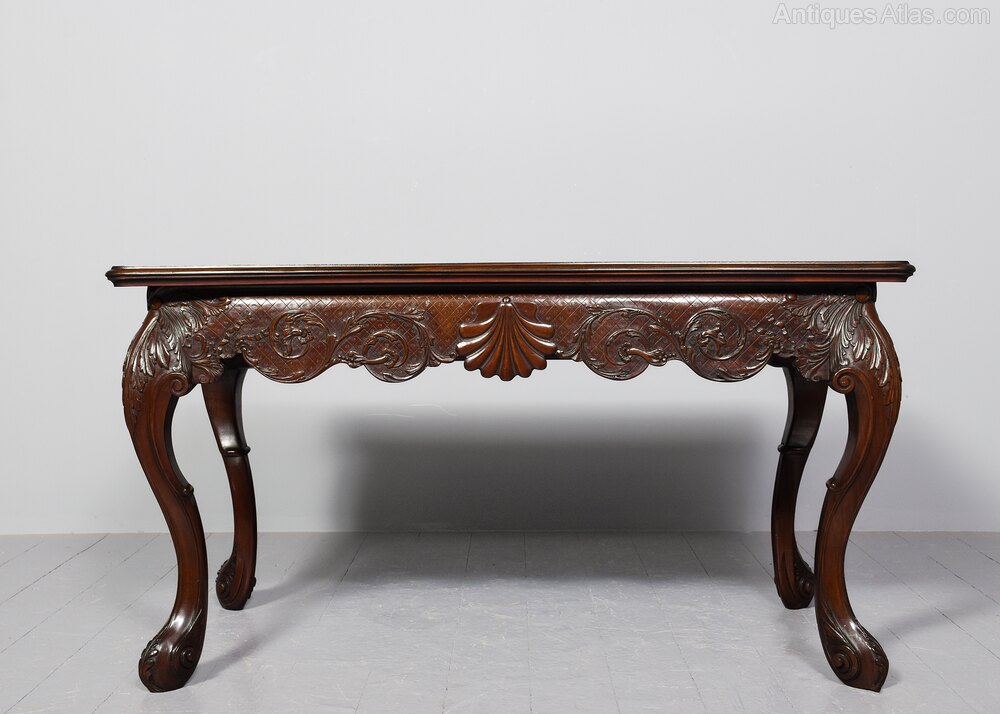 Circa 1880. Outstanding Irish Chippendale style consul table in the manner of Hicks of Dublin. The single-piece rectangular top, with moulded edges on all sides in a quality figured Spanish mahogany. The classical Irish deep frieze with a central shell and rococo foliate decorations, and supported on fluted cabriole legs with bold acanthus carved knees terminating in acanthus decorated scrolled toes. The sides with matching decorated skirts, and the rear legs (unusually) of similar bold construction to the front legs. The antique wood mahogany top (possibly originally had a marble top) has been traditionally restored. 76 cm H x 140 cm W x 72 cm DJames Hicks was born into a family of Dublin chair-makers and was trained in London in the cabinet-making workshops on Tottenham Court Road. On his return to Dublin, he set up businesses in Lower Pembroke Street in 1894 and established what was to become one of the city's leading cabinet-making firms. His clients included Princess Victoria, the Crown Princess of Sweden, and King Edward VII. The firm specialised in high-quality copies of pieces in the styles of Sheraton, Hepplewhite and Chippendale as well as pieces in the style of the prominent 18th century Dublin cabinetmaker and marqueteer William Moore. Hicks described himself as a 'Cabinet Manufacturer, Collector and Restorer of Chippendale, Adam and Sheraton furniture'