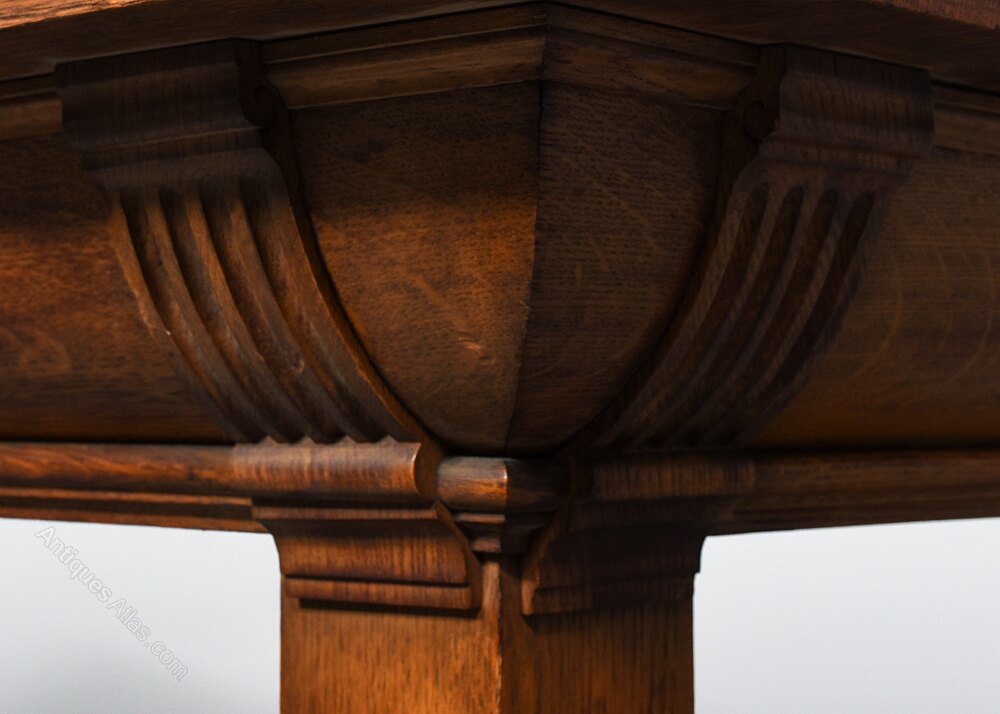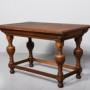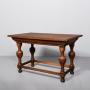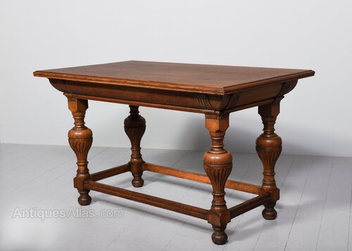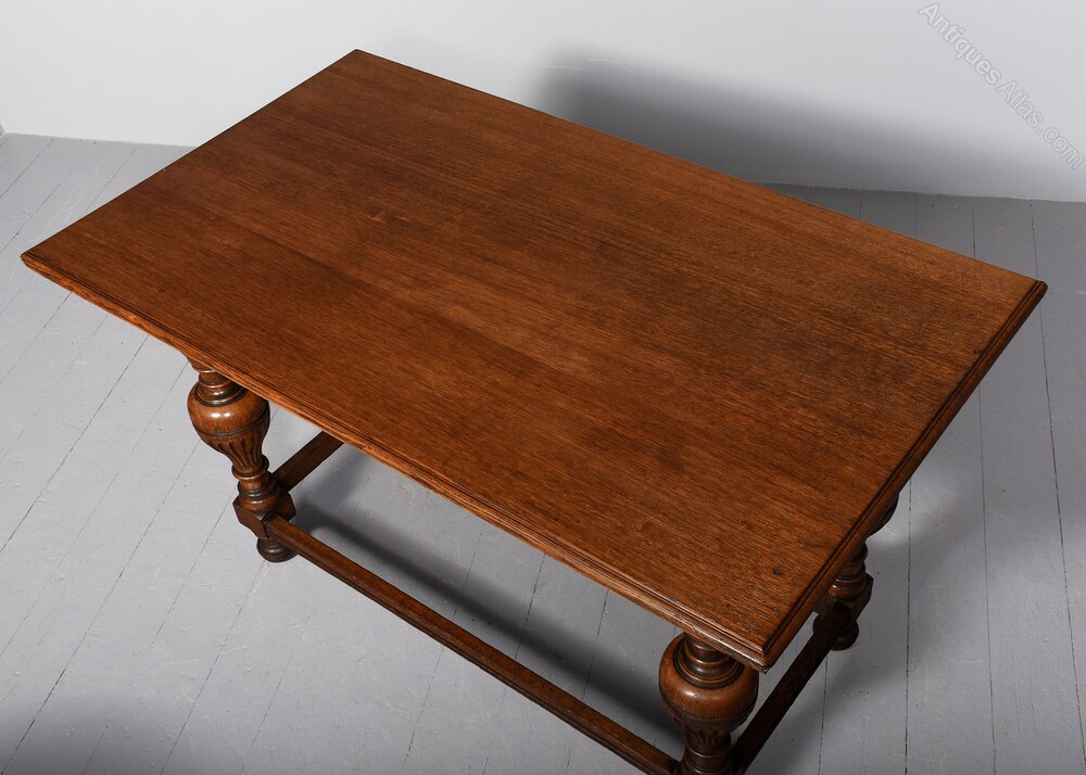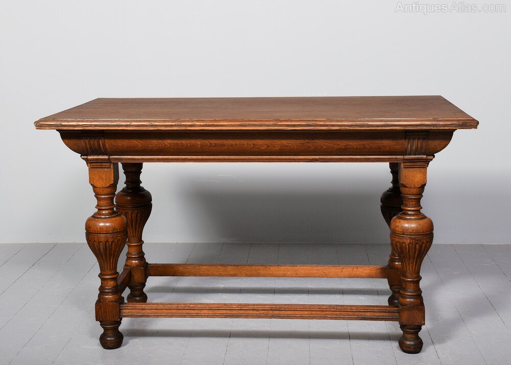 Circa 1870. Mid Victorian rectangular carved oak table, the solid top with a lovely moulded fore-edge, concave frieze with ribbing towards the ends, resting on four stylish bulbous and carved legs, braced by conforming moulded stretchers, with substantial bun feet beneath. (Recently re-polished traditionally).86cm High, 145cm Wide, 83cm Deep