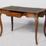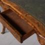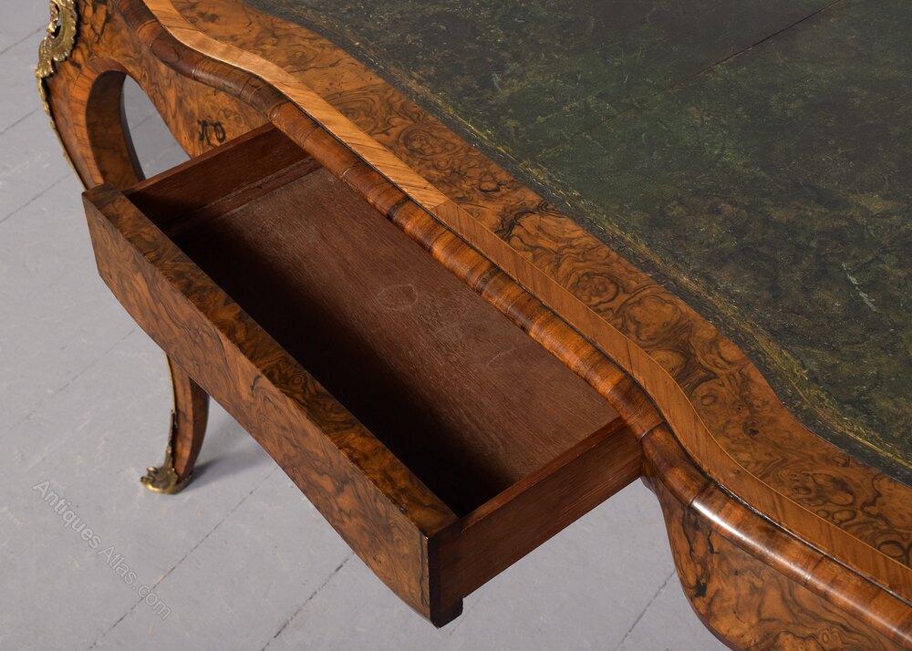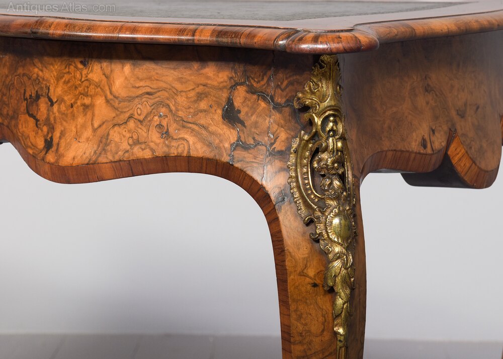 Circa 1860. Attractive Victorian ormolu-mounted burr walnut ladies’ freestanding writing desk. The shaped top with moulded walnut fore-edges, satin wood and boxwood cross banding, and burr walnut with a central green leather writing surface with a hidden frieze drawer in burr walnut and shaped skirt at the sides and back. All supported on bold cabriole legs with ormolu mounts and sabots. Lovely colour and patina.72 cm High x 110 cm Wide x 62 cm Deep