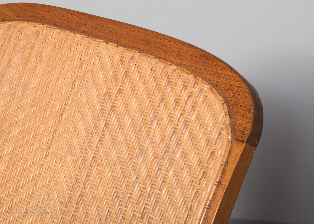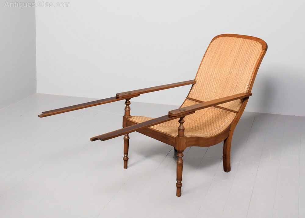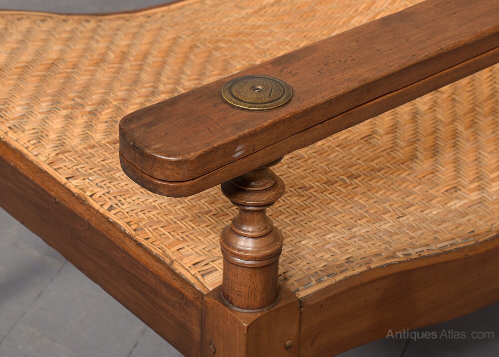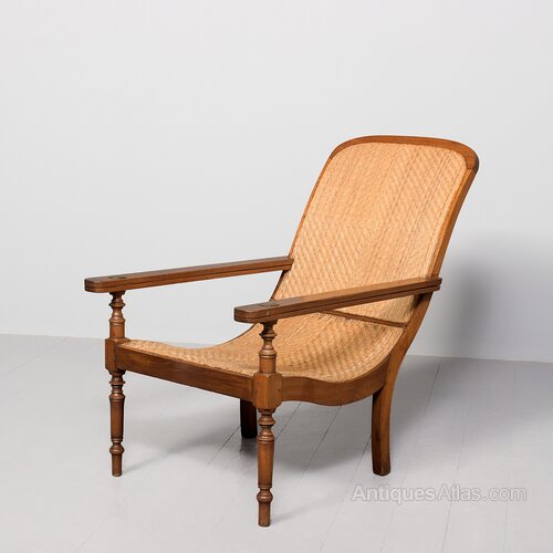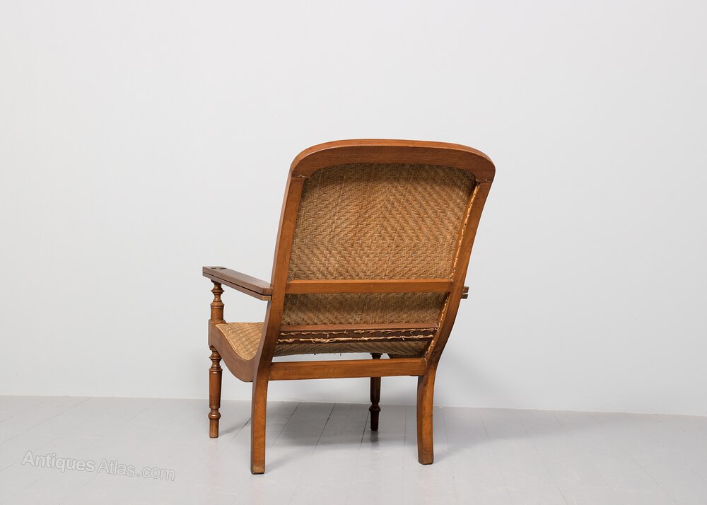 Circa 1860. 19th-century rattan wicker-upholstered Anglo-Indian hardwood planters chair. The arched back with geometric rattan upholstery flanked by two long arms and a long concave seat. The arms with swing-out extensions to the front to hold a tray. All supported on ring-turned tapering front legs and rectangular rear legs. Some very slight Imperfections to the wicker work that is fully sturdy.95 cm High x 67 cm Wide x 113 cm Deep (with arm extensions of 65 cm)