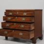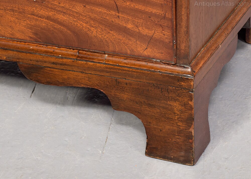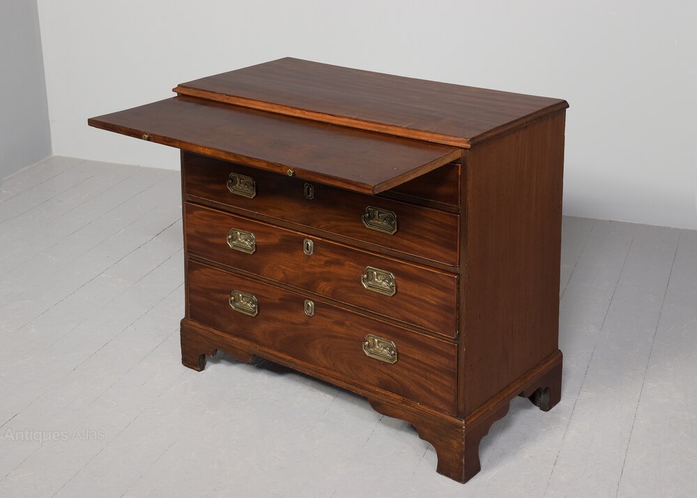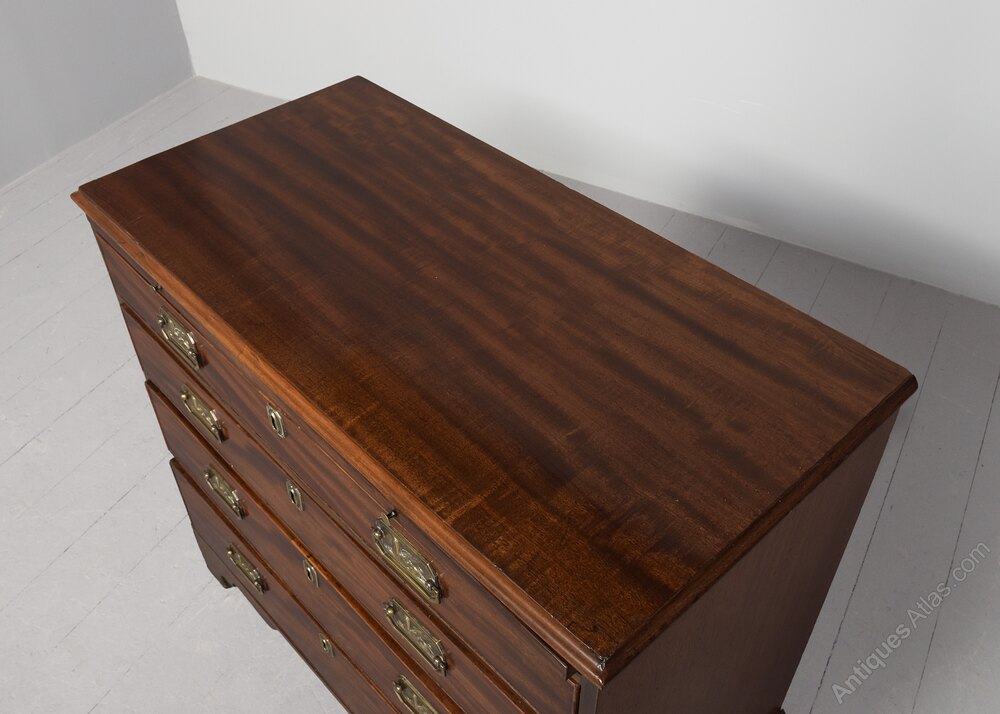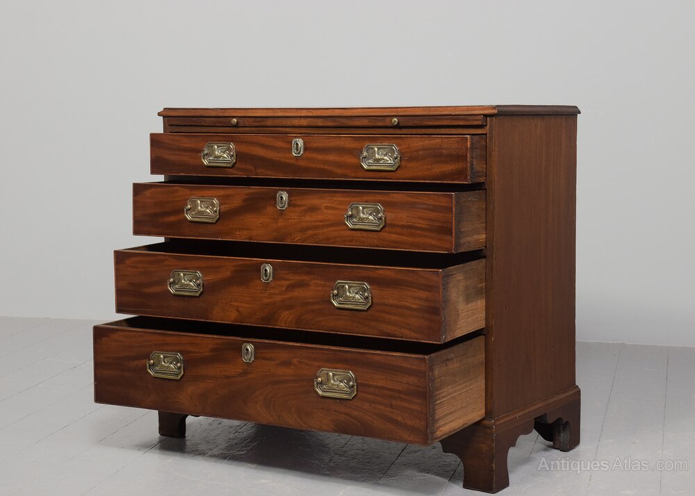 Circa 1810. A late George III mahogany bachelor's chest of drawers, the top in finely figured mahogany with moulded fore edge and pullout slide beneath with two brass knob handles, the four full-length graduating drawers with large rectangular brass escutcheons with canted corners, the brass handles with a winged Griffin with 'Gillows' style handles, all lined in oak, beneath the bottom drawer there is a simple moulding all resting on bracket feet.DateGeorge III