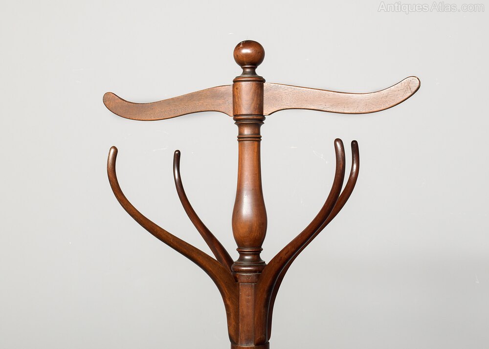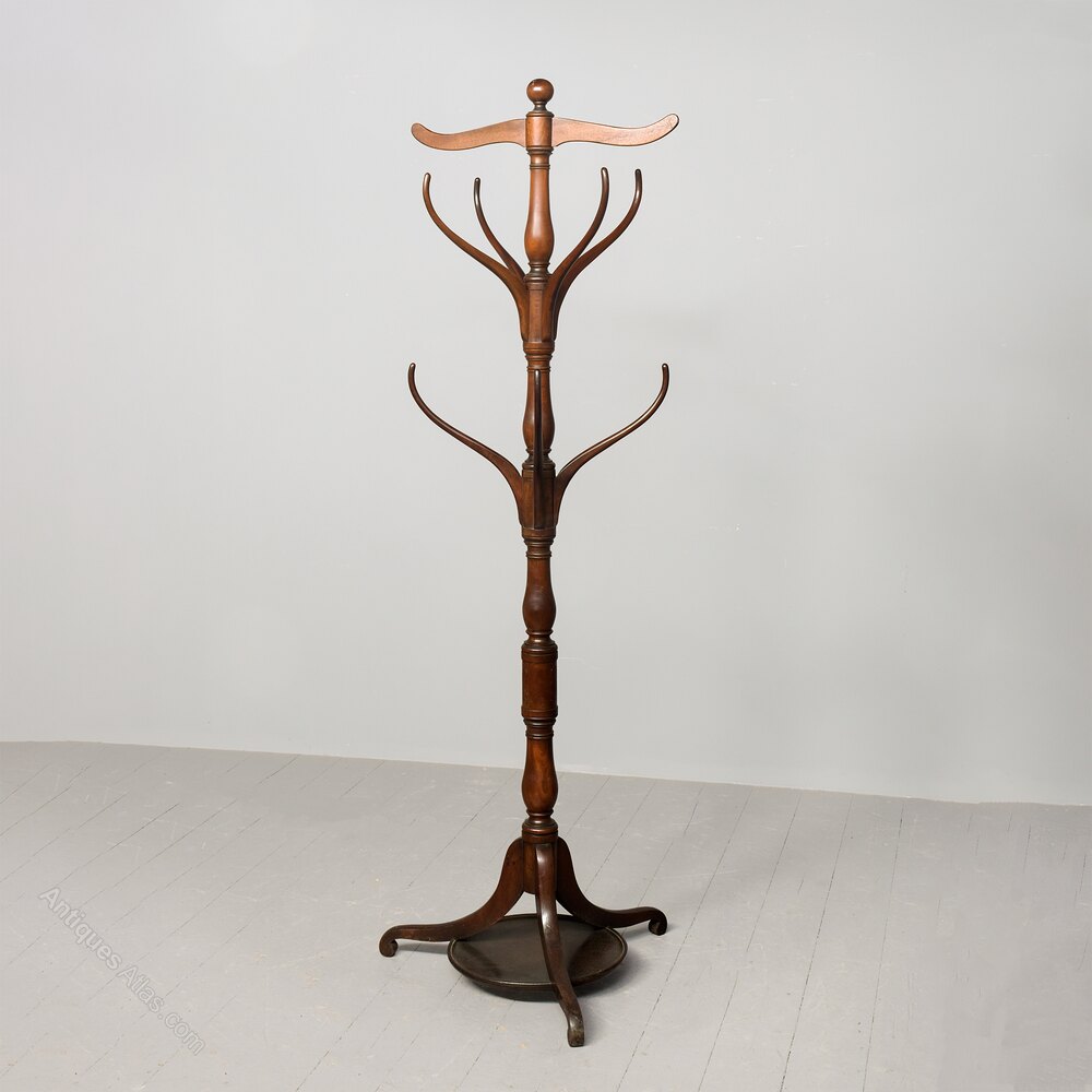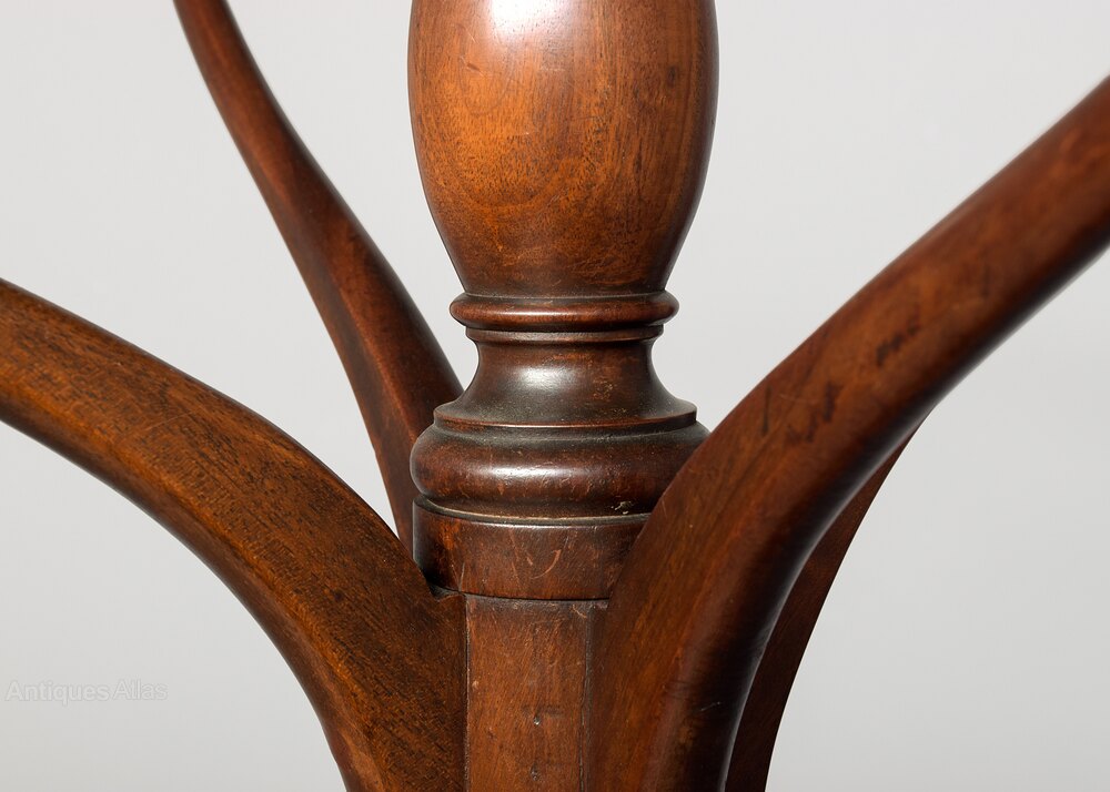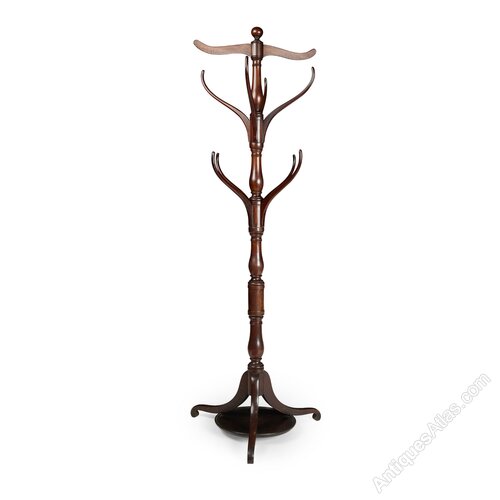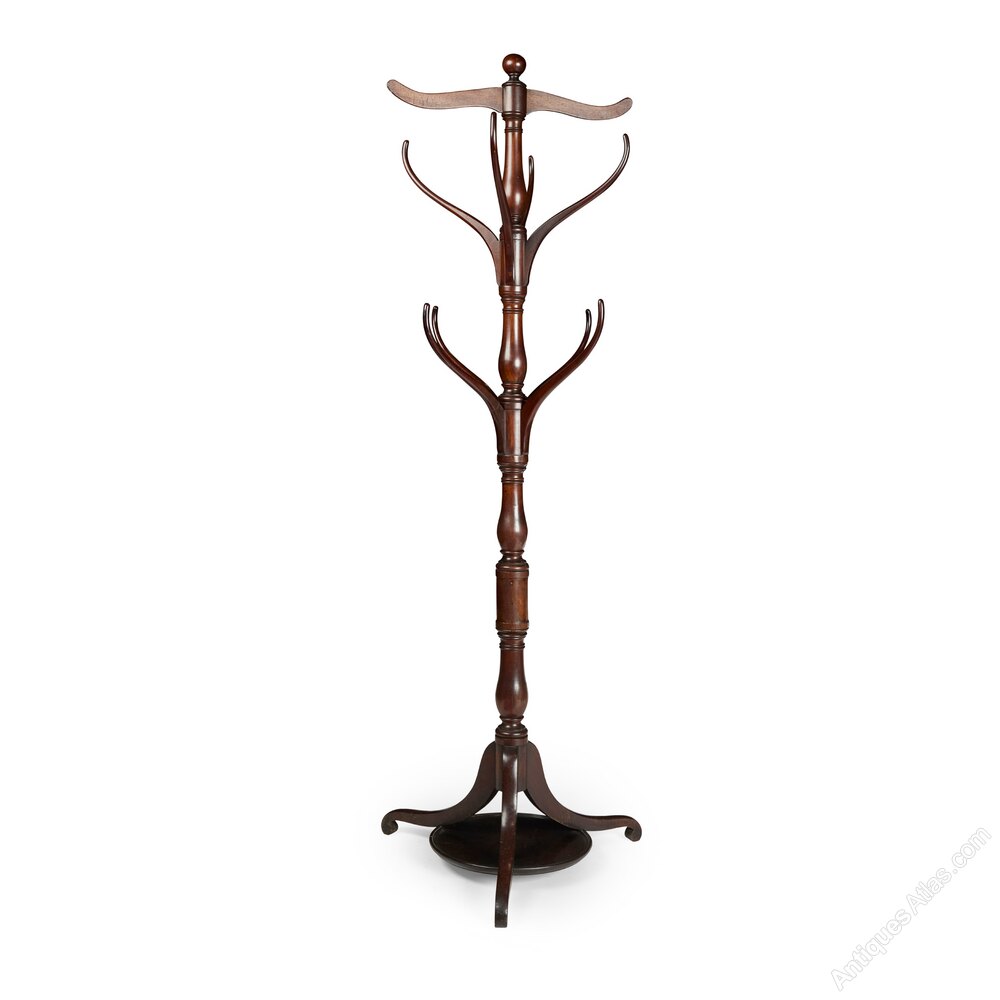 Circa 1815, a Regency mahogany hallstand with a central turned baluster column issuing eight upright branches for coats and hats, with a cross piece at the top, resting on three scroll legs joined by a dished circular under tier.DateRegency