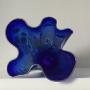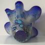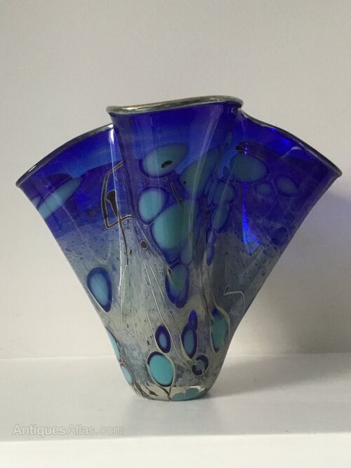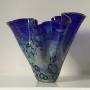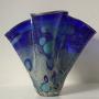 Beautiful American Art Glass Handkerchief Vase by Master Glass Craftsman 'Paul Bendzunas'. Using traditional glassblowing techniques Paul Bendzunas creates unique and distinctive glass at his farm studio. His art is blown from molten glass using five foot long hollow stainless steel tubes. Many of his art pieces depict his love of animals and the Georgia Woodlands.This is a lovely example of Paul Bendzunas' Work. The vase is intricately shaped in a stunning shade of blue. It has a stylised design of circles and ovals in turquoise with blue outer circles. Reed like stems in purple and grey intersperse with the rest of the pattern. Silvery rim around the top edge. The vase has a flat base.