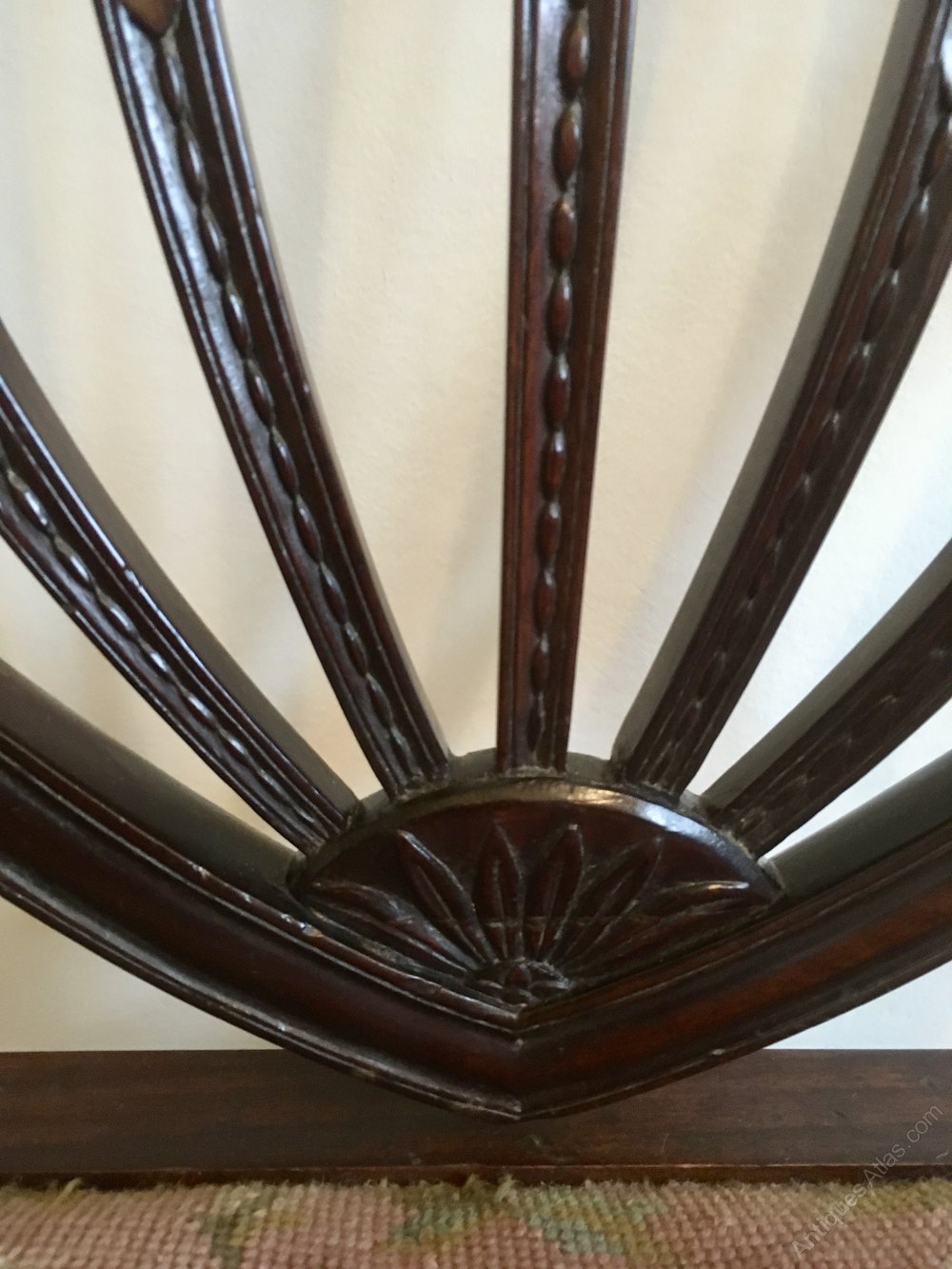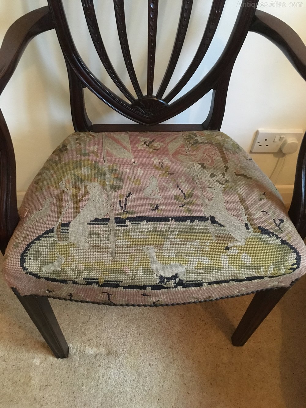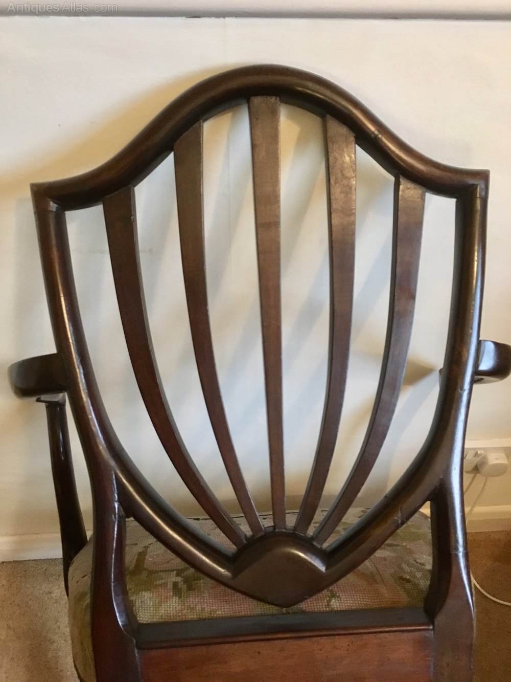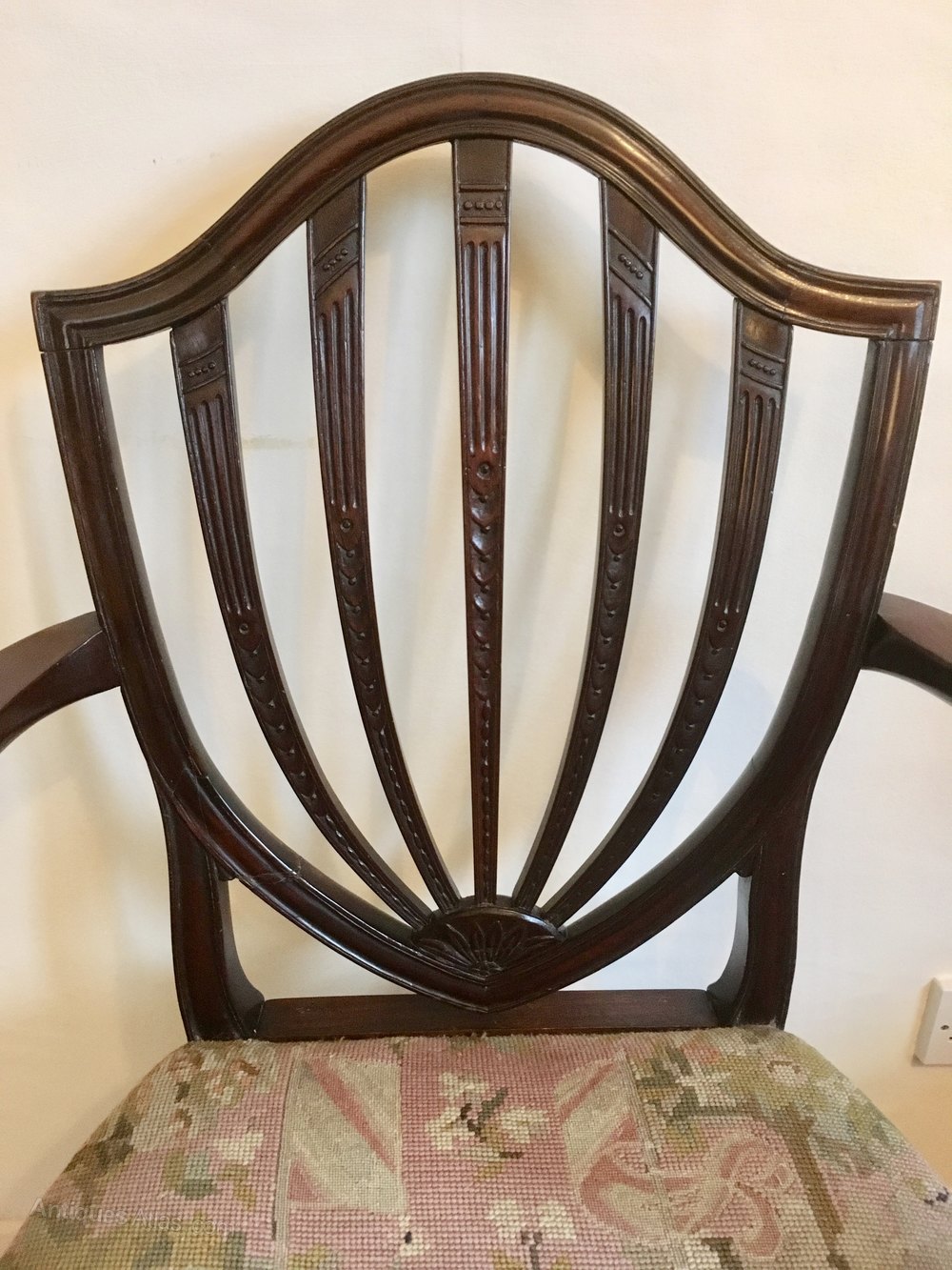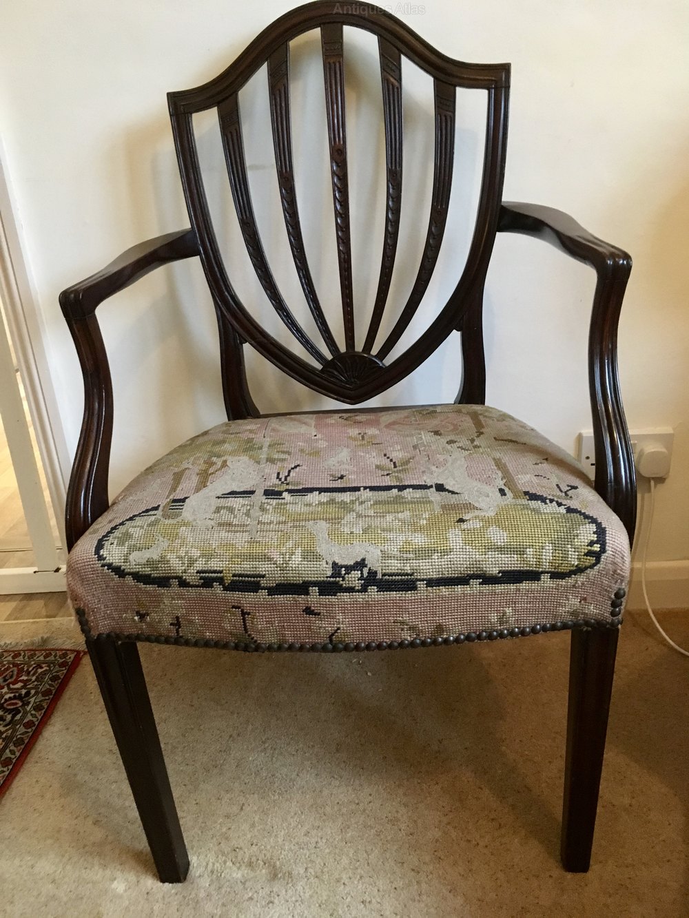 A Georgian Mahogany Shield Back Elbow Chair with Tapestry Stuffover Seat. The Shield Back is carved on the Slats and the legs are square tapered and moulded on the corners.This lovely Chair has had past Restoration but it has been done extremely well and the Chair is very sound.The Tapestry Seat was probably done early 19th cent.The upholstery is sound and not sagging. Date:- c.1790I am listed as a Private Dealer but some of my Stock can be viewed at The Antique Shop, 53, High Street Heathfield E.Sussex.If you wish, I am am able meet you there to discuss any items and also bring along any items which are not on Antiques Atlas but not displayed in the Shop.